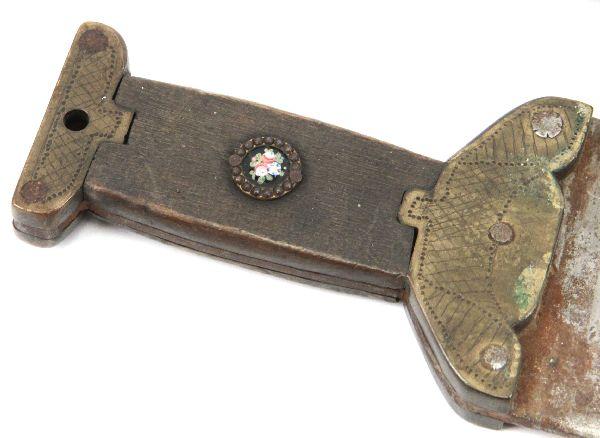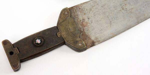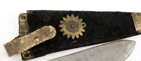 Hand made knife, appearing to be from China or nearby region. Crudely fashioned heavy blade, with bronze fittings, and wooden grips. Leather scabbard, with tacked on brass chape, and sun like design, with Chinese characters in middle.