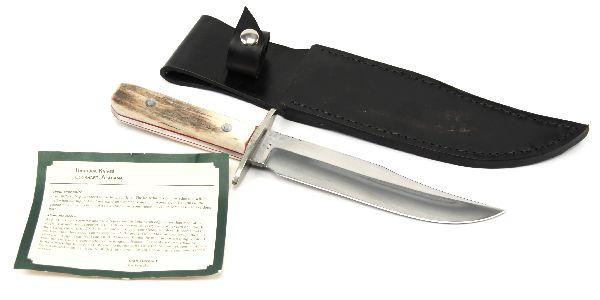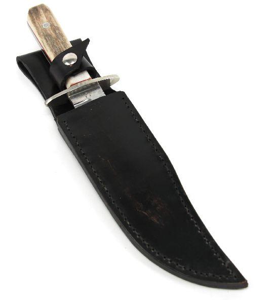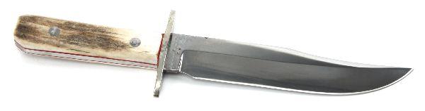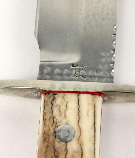 Bone handled Bowie knife, finely hand crafted by John Harbuck, of Lockhart, Alabama. 7 3/4 inch ATS-34 steel blade. Black leather scabbard. Overall very good condition.