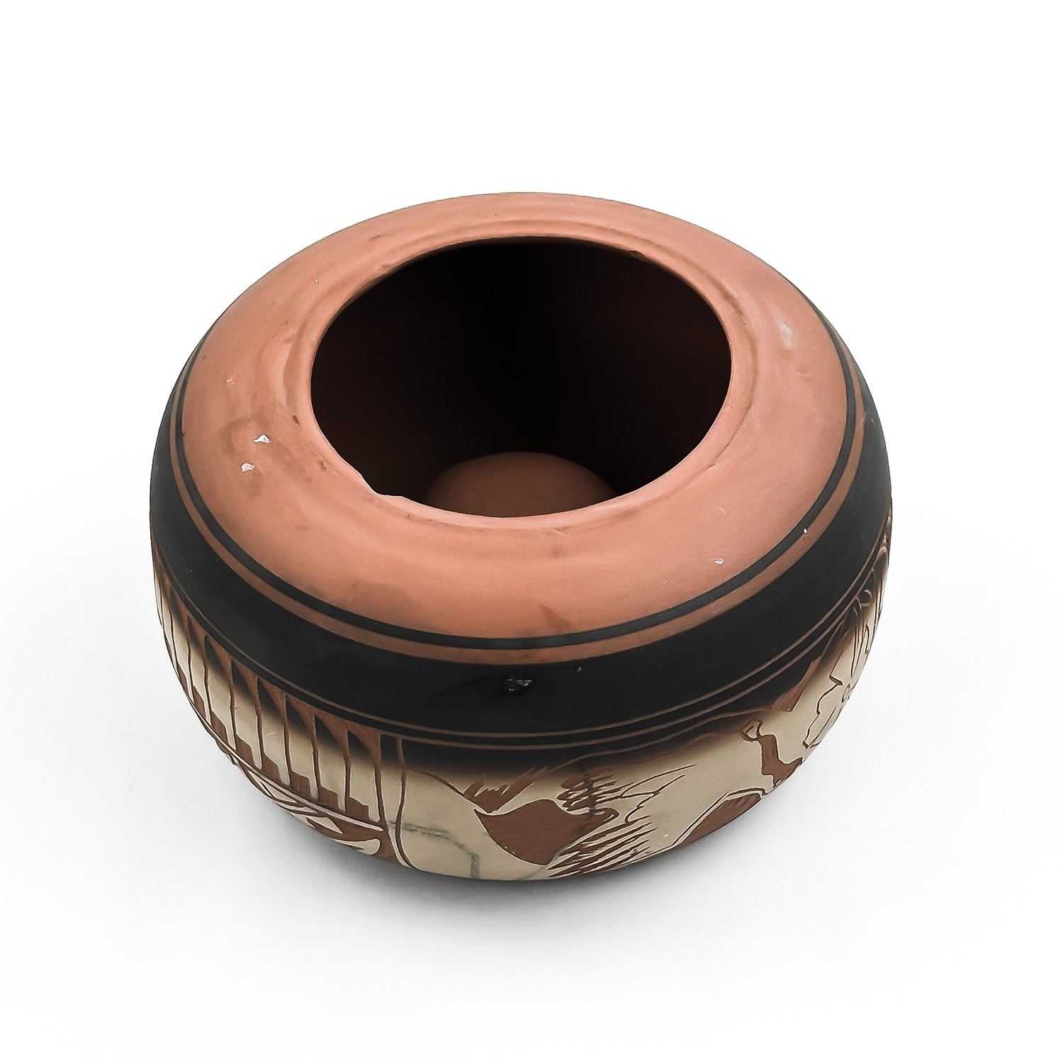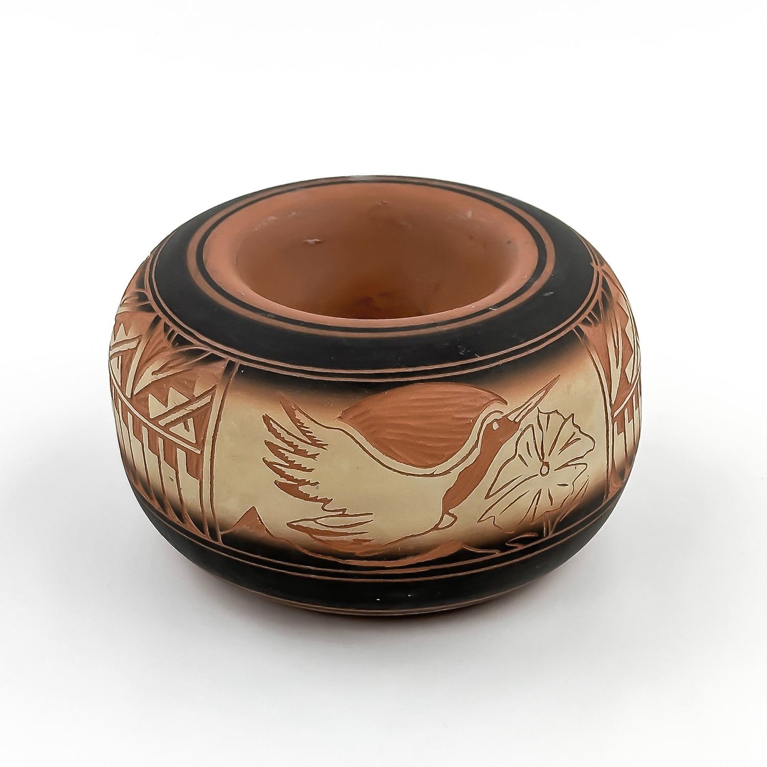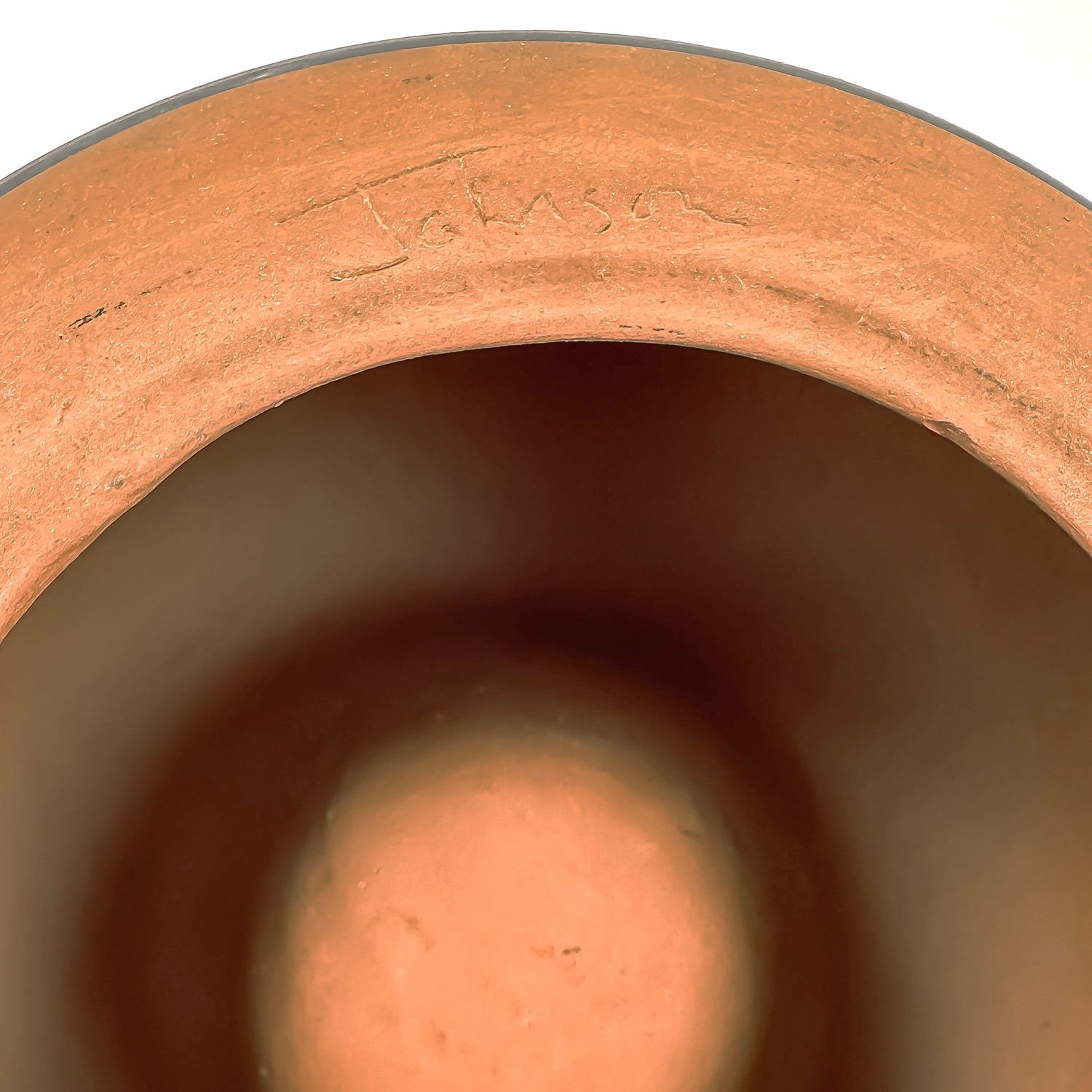 #8103 - SIGNED “JOHNSON” ON BOTTOM - EXACT AGE AND ORIGIN UNKNOWN - PERHAPS NATIVE NAVAJO INDIAN CLAY ART POTTERY? - NOT EXACTLY SURE. IT DOES NOT LOOK LIKE A VASE - BUT IT IS AN INTERESTING LOOKING SCULPTURE. MEASURES: 5.25” (13.5 CM) MIDDLE DIAMETER AND SITS 3.125” (8 CM) HIGH