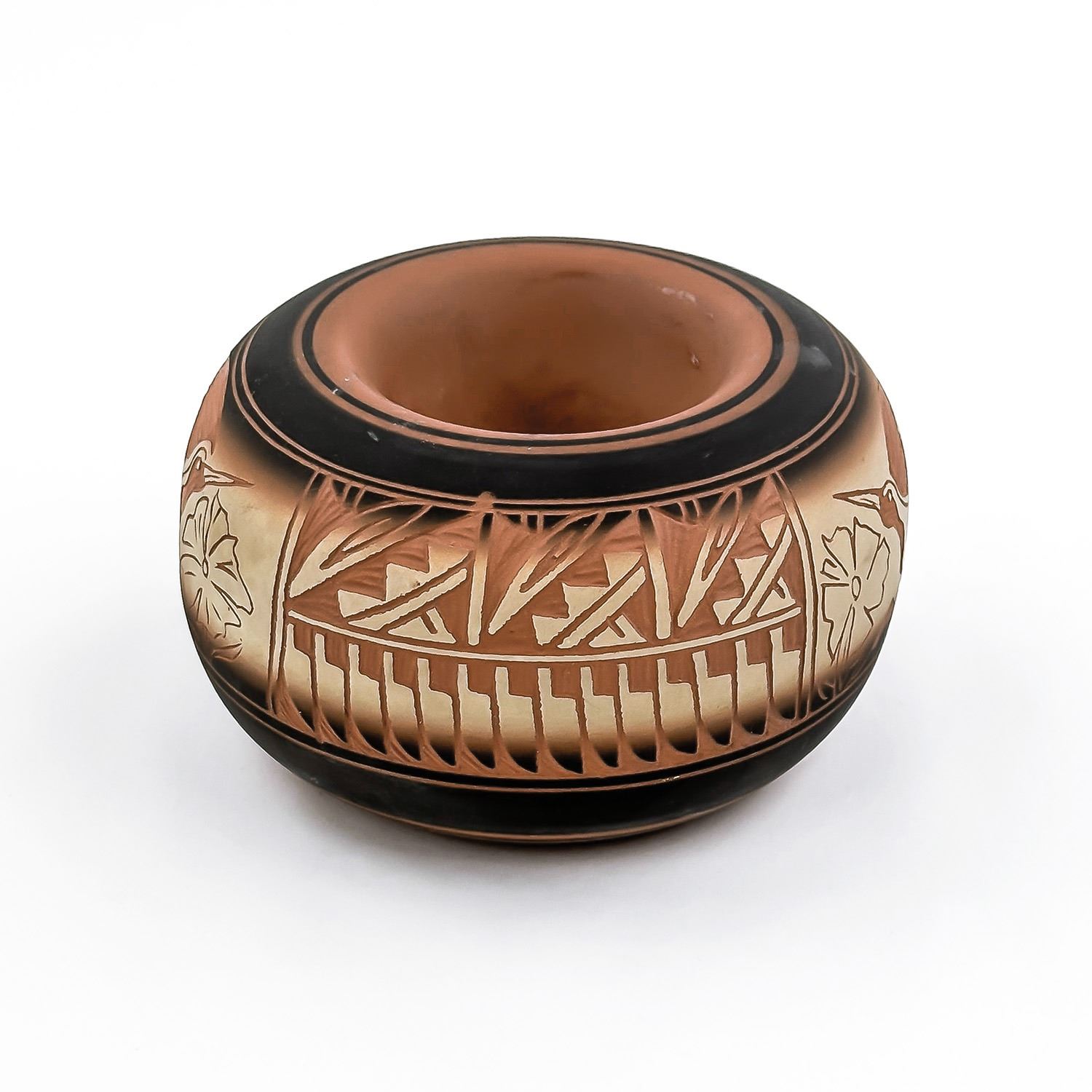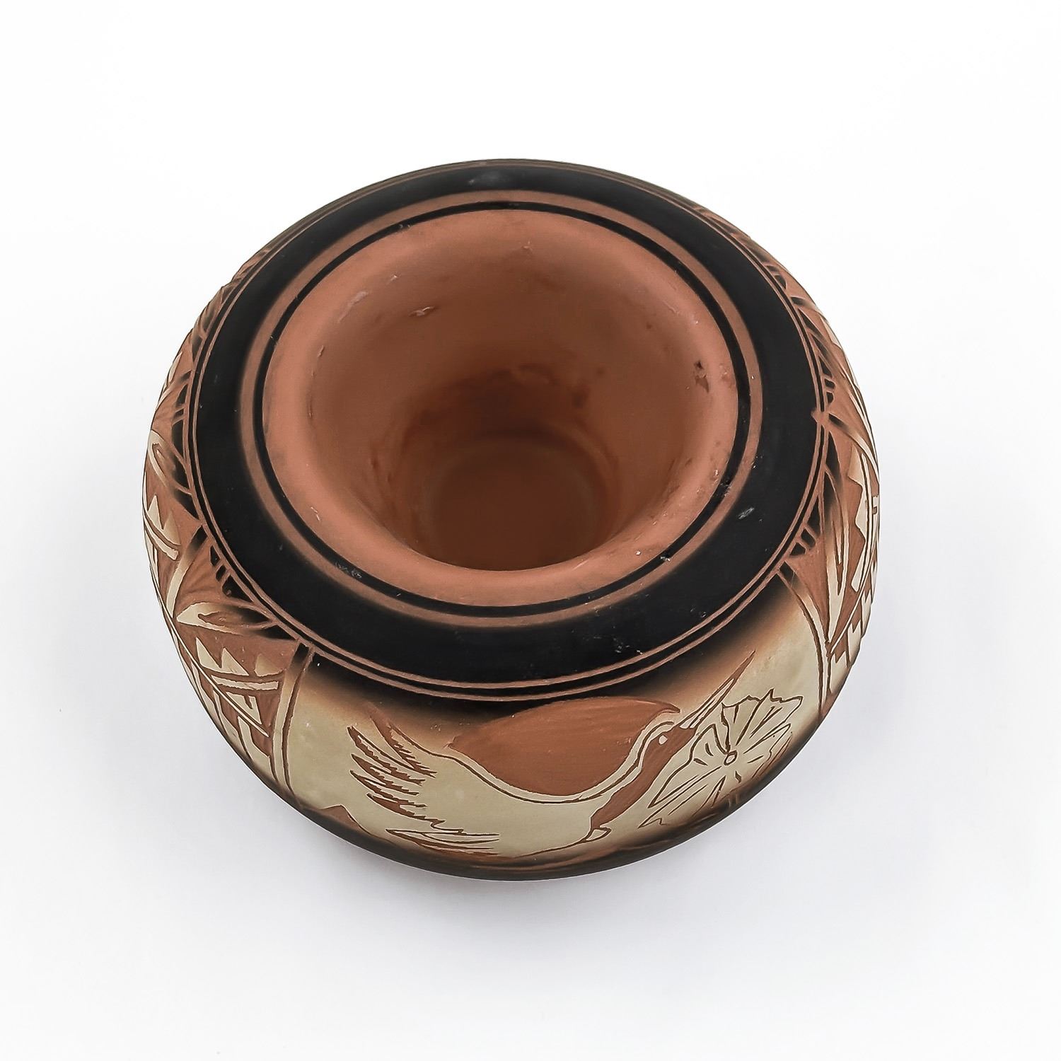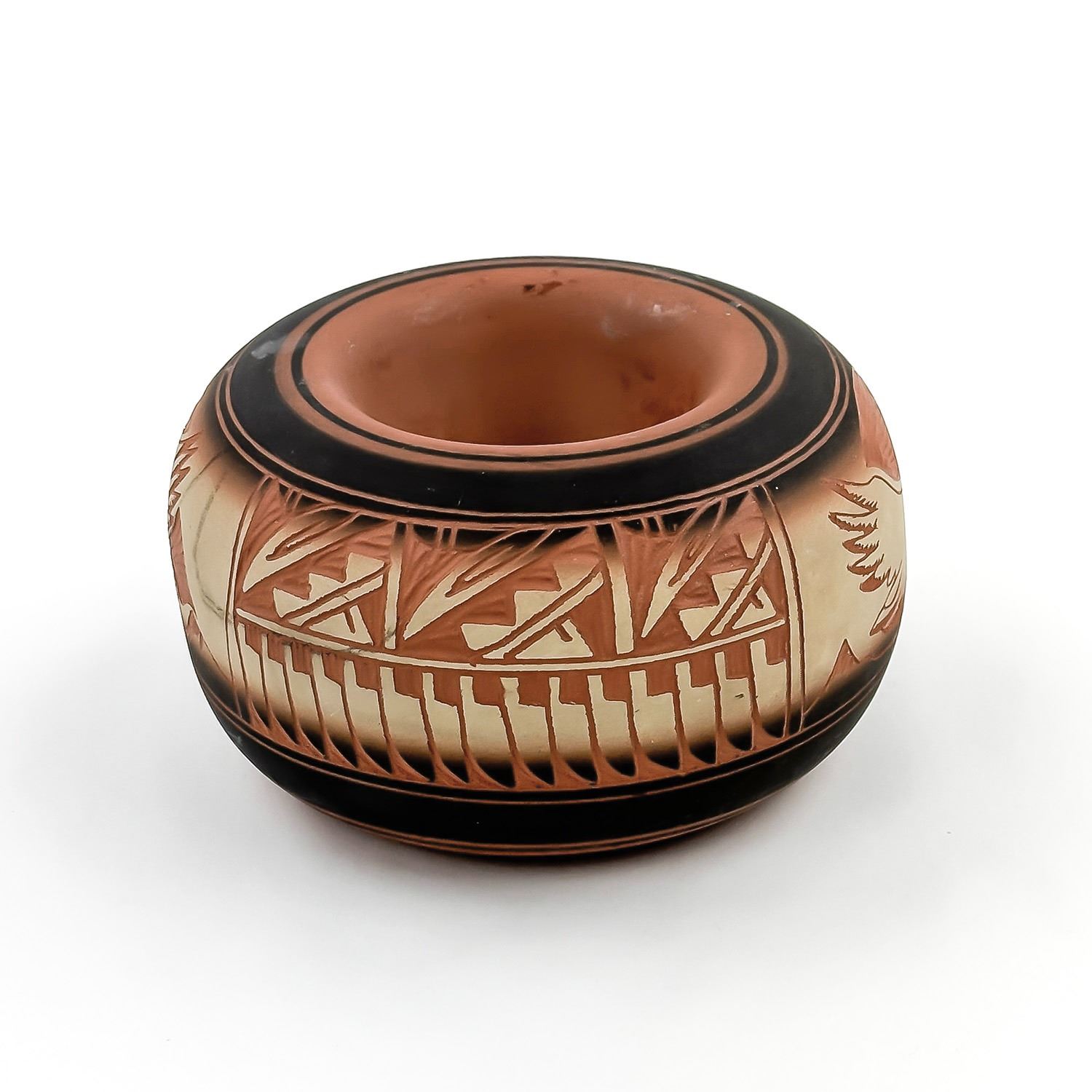 #8103 - SIGNED “JOHNSON” ON BOTTOM - EXACT AGE AND ORIGIN UNKNOWN - PERHAPS NATIVE NAVAJO INDIAN CLAY ART POTTERY? - NOT EXACTLY SURE. IT DOES NOT LOOK LIKE A VASE - BUT IT IS AN INTERESTING LOOKING SCULPTURE. MEASURES: 5.25” (13.5 CM) MIDDLE DIAMETER AND SITS 3.125” (8 CM) HIGH