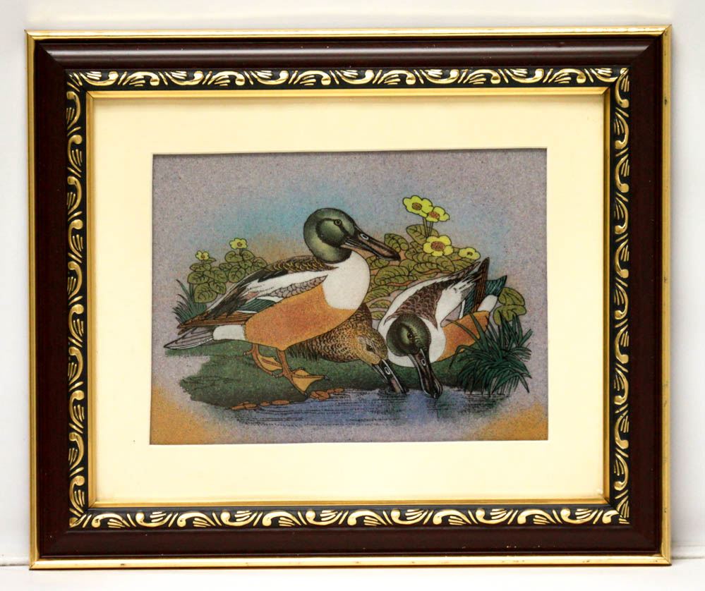 HAND MADE GEM STONE PANTING 3 DUCKS FISHING **|**|** HAND MADE GEM STONE PANTING 3 DUCKS FISHING THE STONES USED TO MAKE THIS PANITHING ARE (AMETHYST, CALCEDONY, CORNELIAN AGATE, GARNET, GREEN AVENTURINE, BLOOD STONE, RED JASPER, SODALITE, TURQUOISE, YELLOW AGATE) READY TO HANG