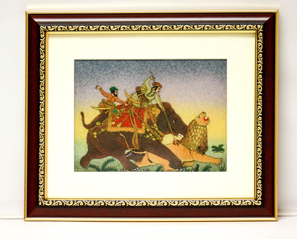 HAND MADE GEM STONE PANTING OF MEN HUNTING A LION **|**|** HAND MADE GEM STONE PANTING OF MEN AND A ELEPHANT HUNTING A LION THE STONES USED TO MAKE THIS PANITHING ARE (AMETHYST, CALCEDONY, CORNELIAN AGATE, GARNET, GREEN AVENTURINE, MELAKITE, RED JASPER, PERIDOT, TURQUOISE, YELLOW AGATE) READY TO HANG