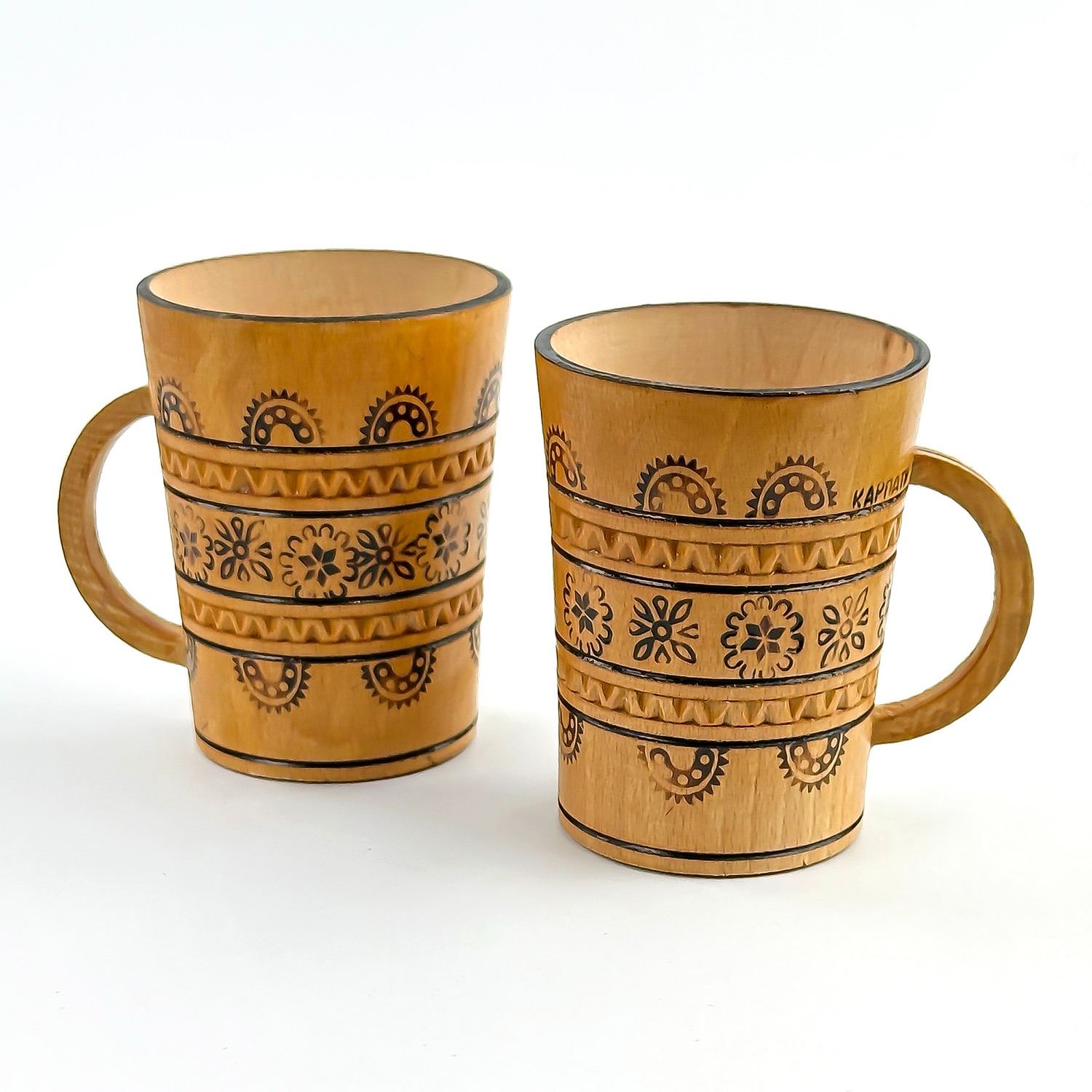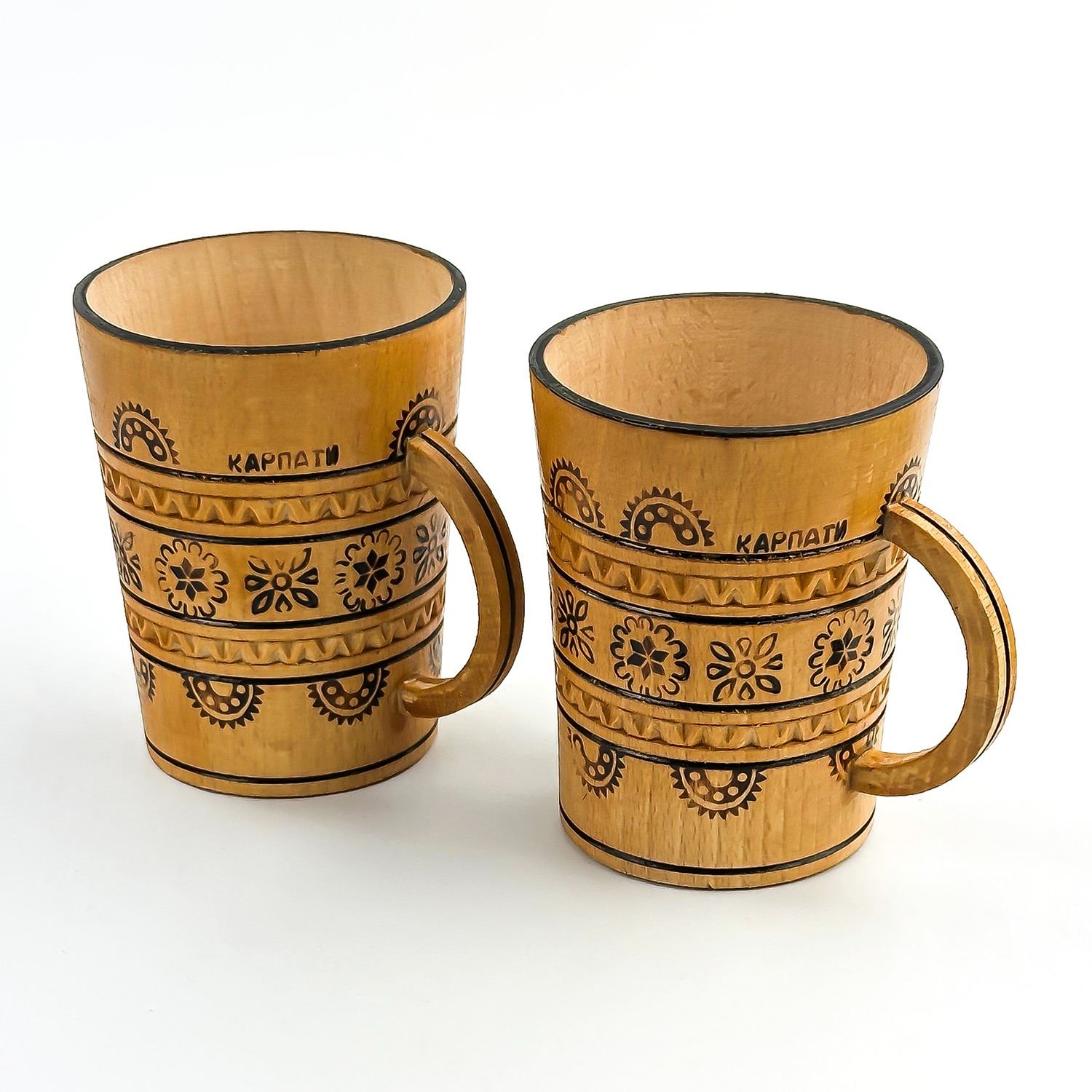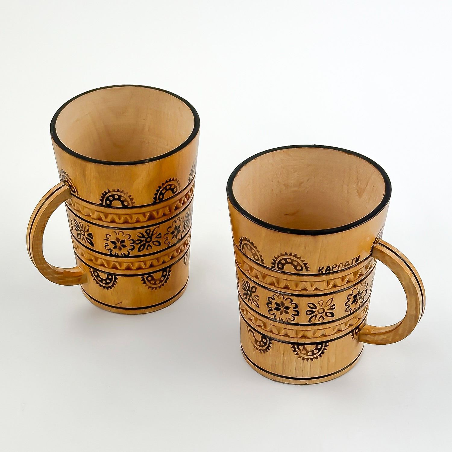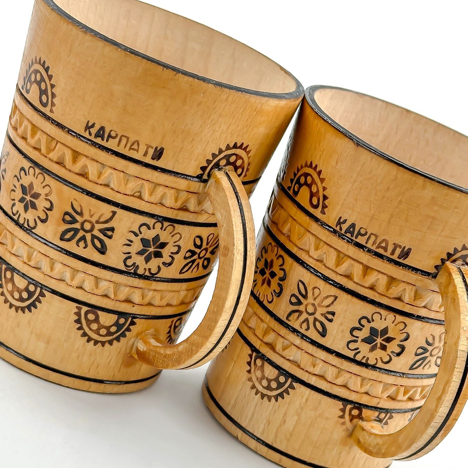 #8795 - PAIR OF VINTAGE HAND CRAFTED WOODEN CUPS - UKRAINE. WOODEN PYROGRAPHY WOOD BURNING FOLK ART MUGS CUPS. HOME OR BAR DECOR. MEASURES: 3.5” (9 CM) TALL BY 2.75” (7 CM) TOP DIAMETER