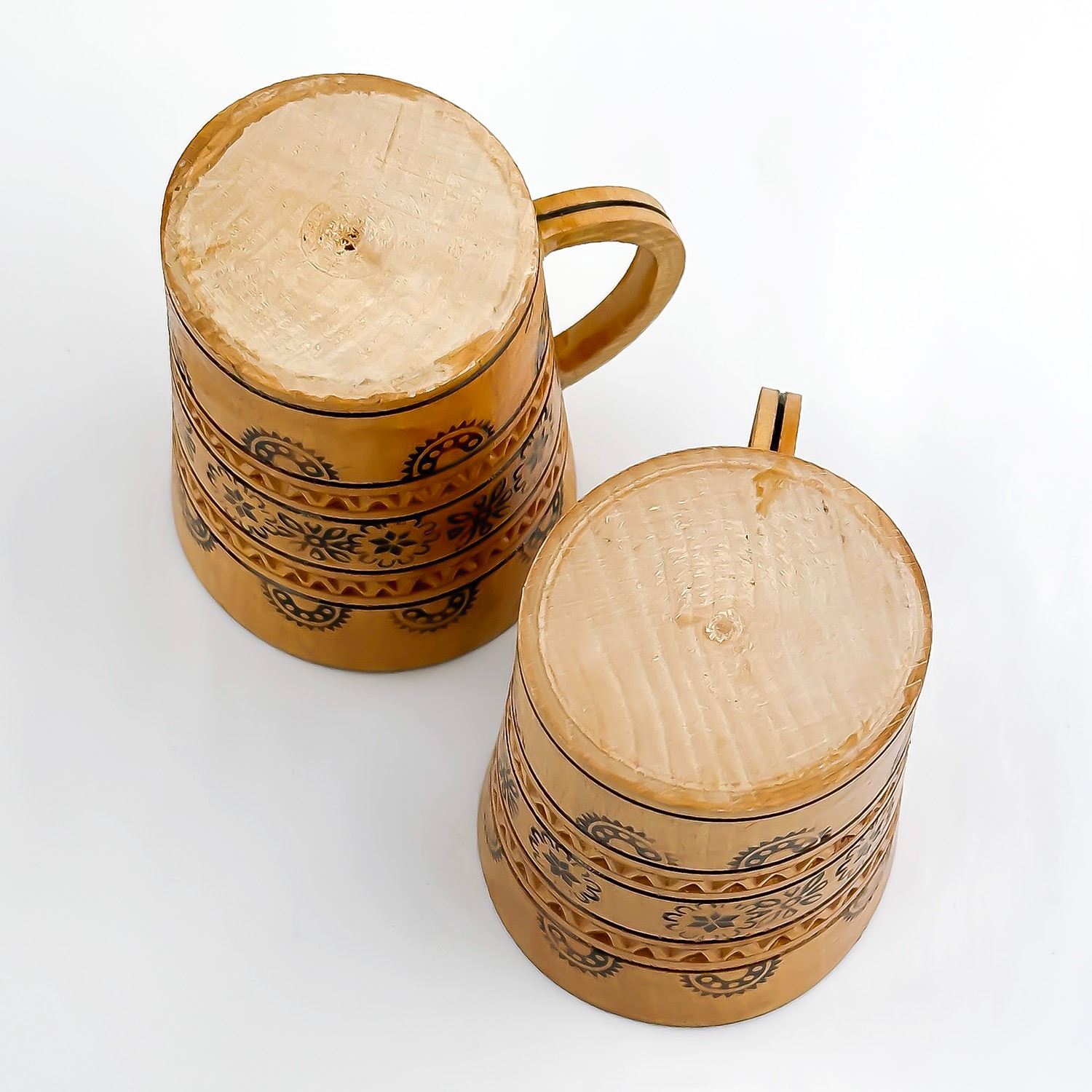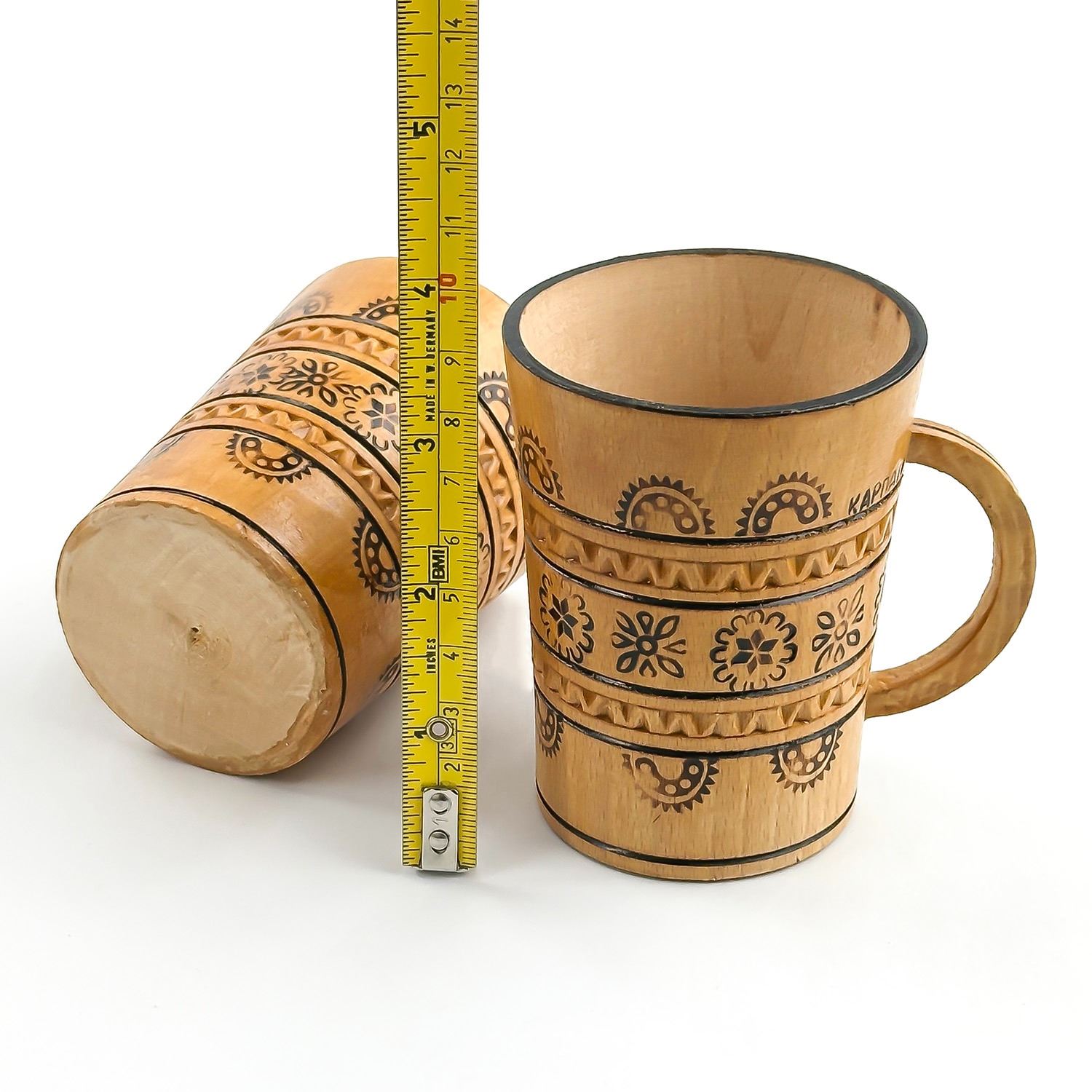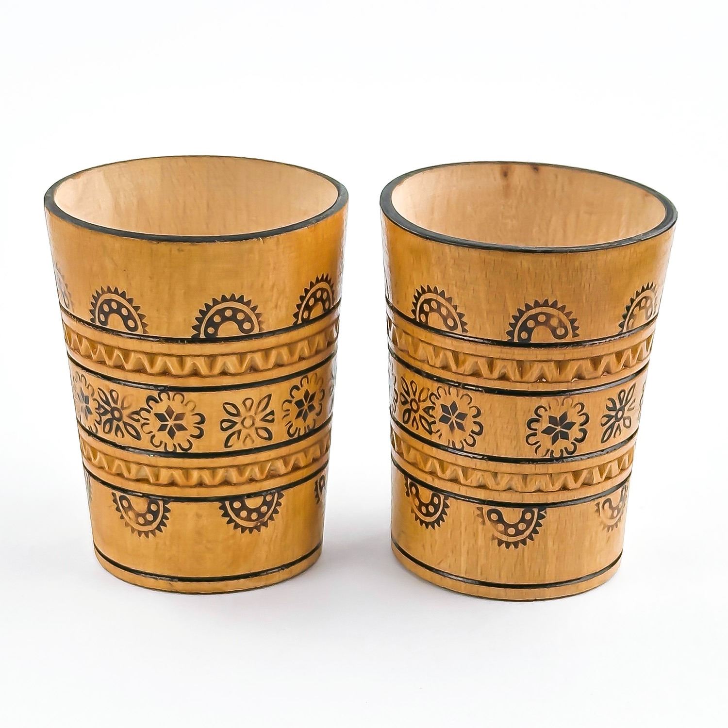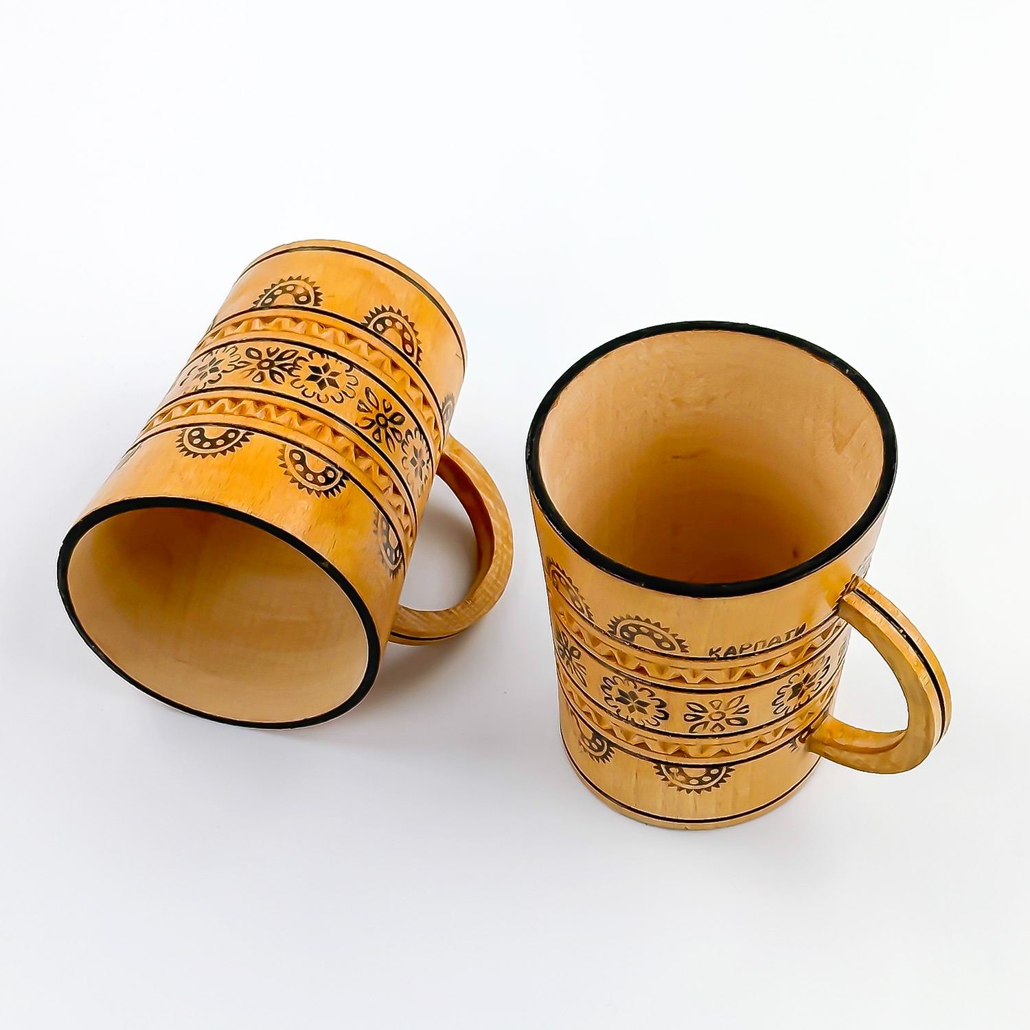 #8795 - PAIR OF VINTAGE HAND CRAFTED WOODEN CUPS - UKRAINE. WOODEN PYROGRAPHY WOOD BURNING FOLK ART MUGS CUPS. HOME OR BAR DECOR. MEASURES: 3.5” (9 CM) TALL BY 2.75” (7 CM) TOP DIAMETER