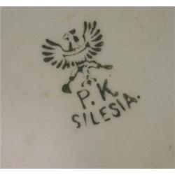 HAND PAINTED AND FLORAL DECORATED DRESSER TRAY. Floral and gilt decoration on inside. Marked on bottom "P.K. Silesia" with eagle. 9.5" W