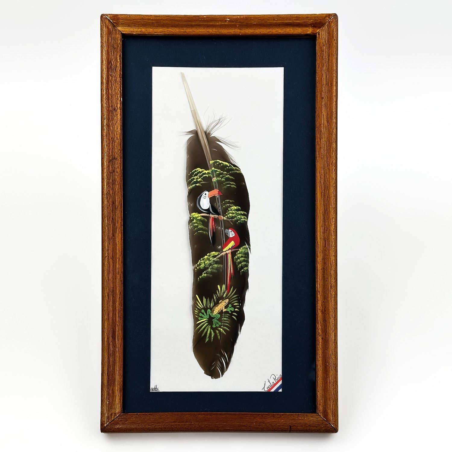 #8641 - PARROT TOUCAN BIRD FROG DESIGN - FRAMED UNDER GLASS. FEATHER MEASURES: 10.25” (26 CM) LONG BY 1.75” (4.5 CM) WIDE. FRAME MEASURES: 13.5” (34.5 CM) BY 7” (17.5 CM)***ITEM(S) LOCATED IN LETHBRIDGE ALBERTA. FREE TRANSPORT TO EDMONTON OFFICE AVAILABLE FOR THIS AUCTION. WORLDWIDE SHIPPING IS AVAILABLE FOR ALL ITEMS
