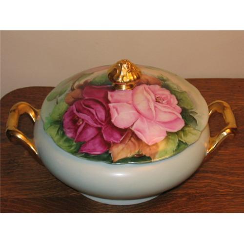 HERE IS A STUNNINGLY BEAUTIFUL HAND PAINTED ARTIST SIGNED COVERED BOWL WITH GORGEOUS PINK AND CRANBERRY ROSES. THE ARTWORK ON THE ROSES OF THIS PIECE IS SUPERB. THE LOWER PART OF THE BOWL IS A CREAMY LIGHT GREEN COLOR AND THERE IS HEAVY GOLD GILDING ON THE HANDLES AND FINIAL AS CAN BE SEEN IN THE IMAGES. EXCELLENT CONDITION WITH NO CHIPS CRACKS HAIRLINES OR REPAIRS AND NO GOLD WEAR! ARTIST IS C. DURFLINGER. MEASURES 6.5" TO FINIAL AND 10.5" HANDLE TO HANDLE.