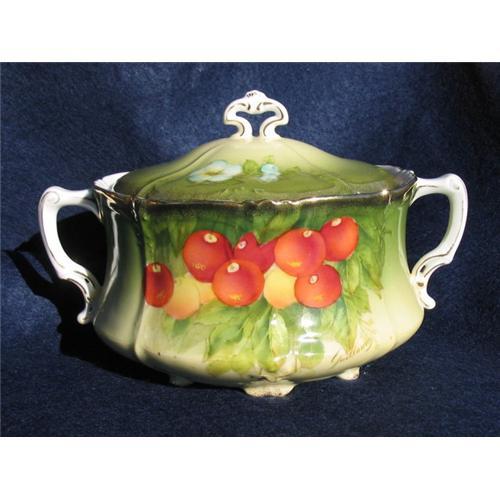BAVARIAN BISCUIT JAR WITH LOVELY PICTURE OF CLUSTERS OF CHERRIES SET AGAINST A LEAFY BACKGROUND. THE JAR MEASURES 8" HANDLE TO HANDLE AND 5.5" HIGH. THERE ARE NO CHIPS CRACKS HAIRLINES OR REPAIRS. MARK IS TIRSCHENREUTH, BAVARIA IN GREEN UNDERGLAZE. BEAUTIFUL ARTWORK AND IN GREAT CONDITION!