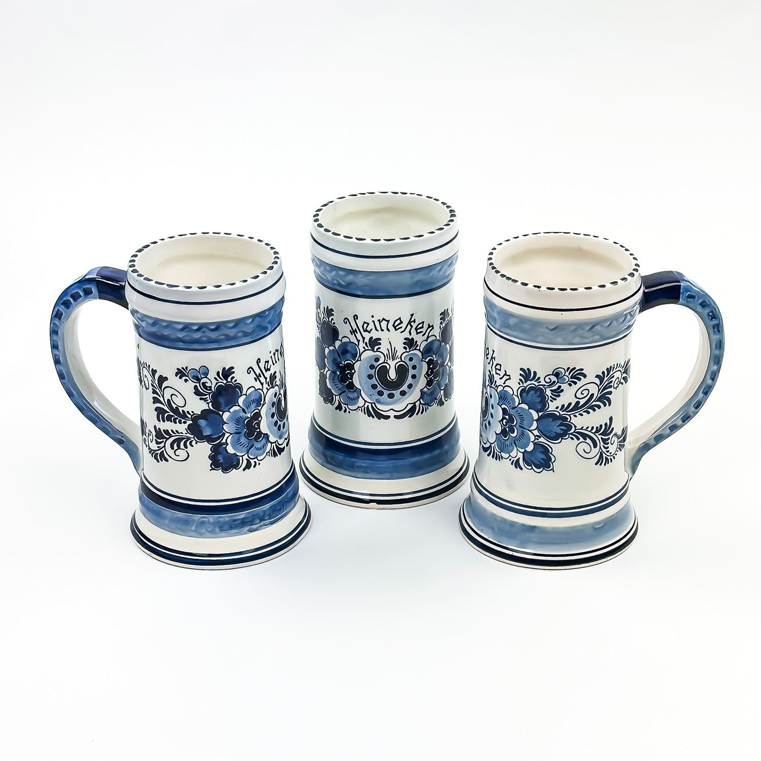 #8869 - MADE IN HOLLAND - 3 HEINEKEN BEER STEINS CUPS MUGS. GLAZE SHOWS CRAZING AND ONE STEIN HAS A HAIRLINE CRACK DOWN THE SIDE - GOOD DISPLAY PIECES. THEY MEASURE: 5.5” (14CM) TALL WITH A 3.5” (9 CM) DIAMETER BASE***ITEM(S) LOCATED IN LETHBRIDGE ALBERTA. FREE TRANSPORT TO EDMONTON OFFICE AVAILABLE FOR THIS AUCTION. WORLDWIDE SHIPPING IS AVAILABLE FOR ALL ITEMS