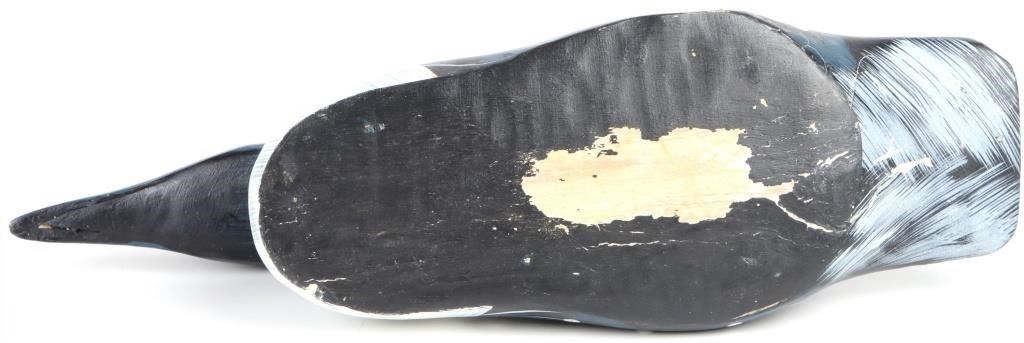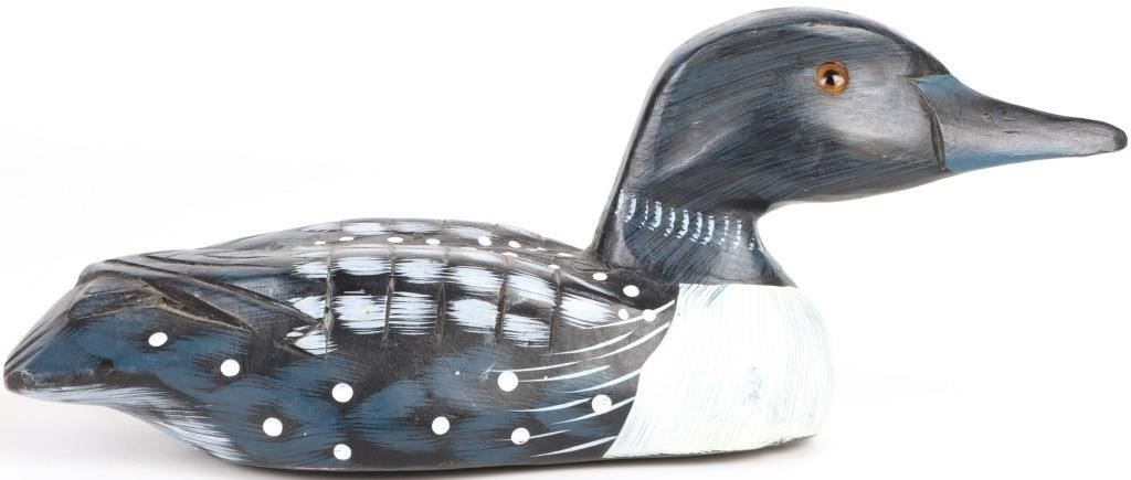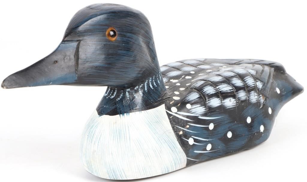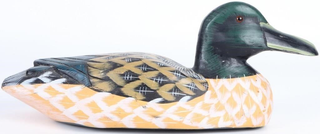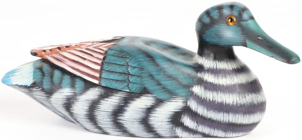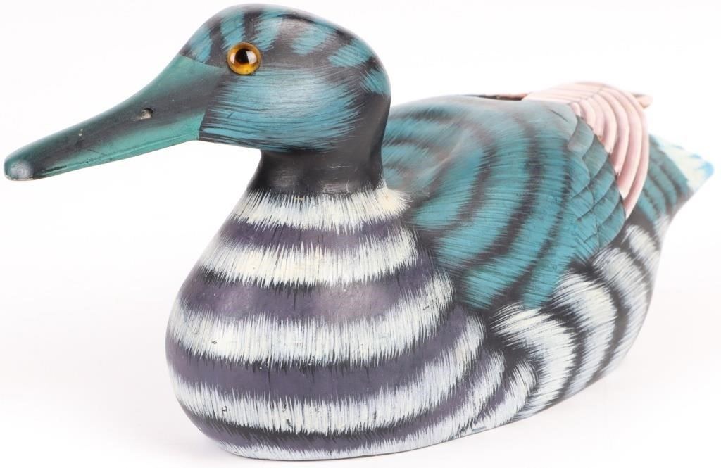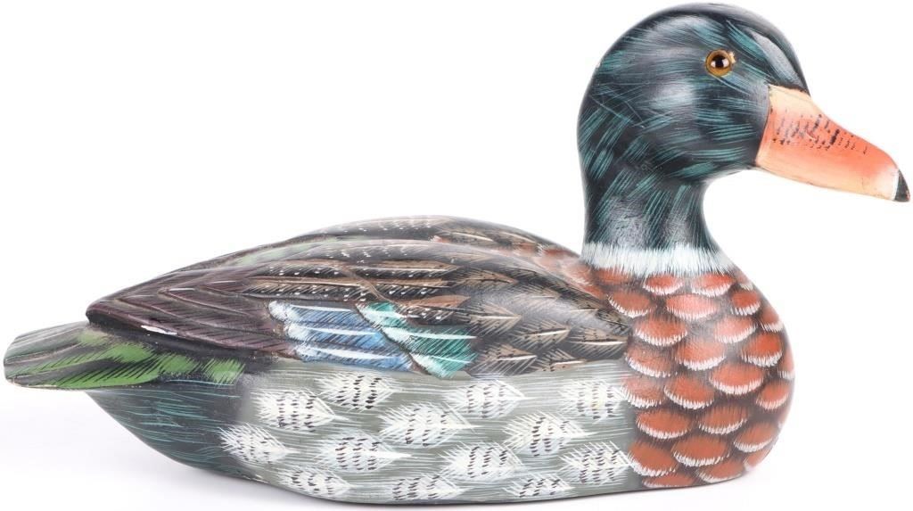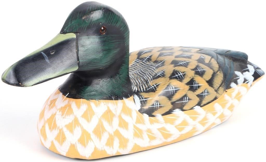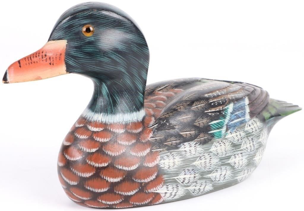 Hand-painted and carved wooden decoy ducks. Ducks include two small painted ducks, one with teal details and one with orange and green details, one medium sized duck that has dark blue details, and one larger duck with yellow and green details.