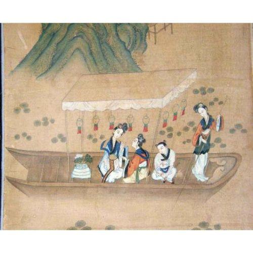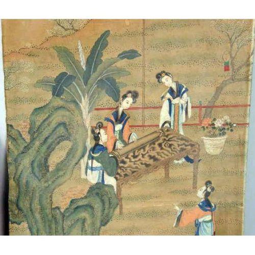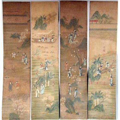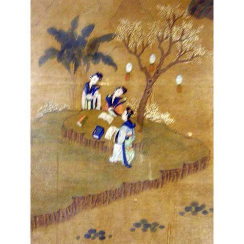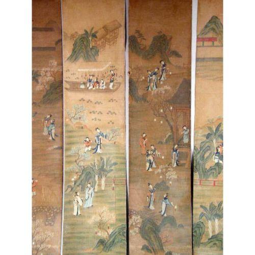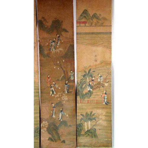 HAND-PAINTED CHINESE WALLPAPER<BR><BR>possibly 18th century. Subsequently mounted on canvas and backed with chipboard, which could be easily removed. The ornate scene depicting pavilions, temples, mountains, trees, fantastic rock formations, exotic foliage, walled compounds, and showing a wide range of men, women and children engaged in activities such as boating, drinking tea, eating, doing calligraphy, tutoring, reading, playing Go, playing a Guqin, strolling and gossiping. Each segment 86" h x 20" w, for a total width of approximately 33 ft. Two sections with small cutouts for light fixtures, and a T-shaped cutout for a hinge (?)