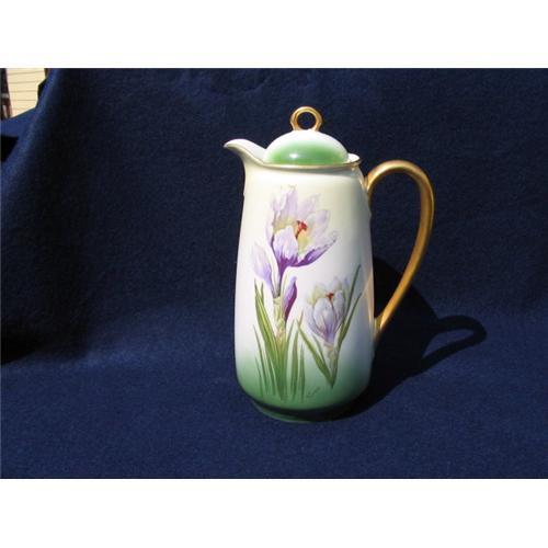 EXQUISTE AND GORGEOUS IS THIS HAND PAINTED ARTIST SIGNED CHOCOLATE POT MADE BY ALTENBERG. IT FEATURES LAVENDER IRISES ON A GREEN AND WHITE
