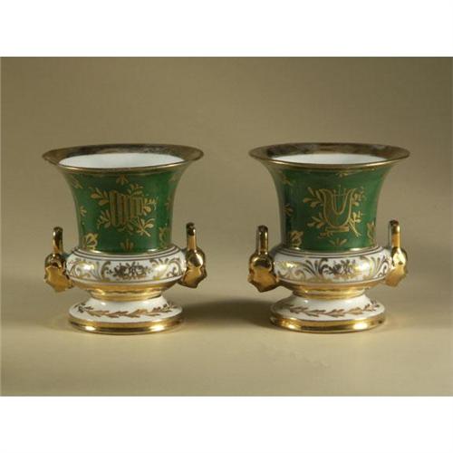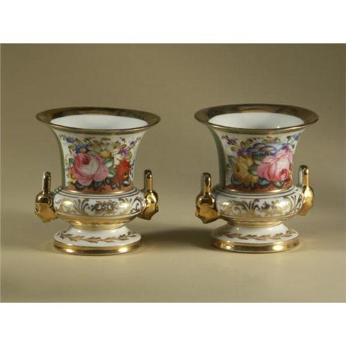 PORCELAIN: A pair of unattributed, trumpet shaped, continental, hand painted, double handled vases, 5.75'' x 5.50'' at the mouth of the vase, having hand painted floral scenes on the upper portion. Edges are gold trim as are the handles; the lower portion of the vase is gold scrollwork, late 19th or early 20th century. Note: gold is worn on portions of the handles and trim, no chips or damage noted.