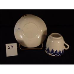 Pearlware? Hand-painted demitasse cup & saucer, ca 1850, blue & white feather and dot design, unmarked. Cup is painted inside and out, and measures 2.25" and 2.5" in diameter, saucer is 4.5". Blue underglaze factory "smears", but no damage.