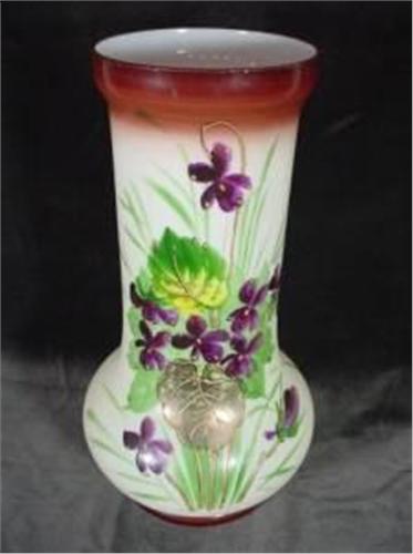 HAND PAINTED FLORAL MOTIF ON OPAQUE VASE WITH BROWN RIM AND BASE.10.5"X5.5".