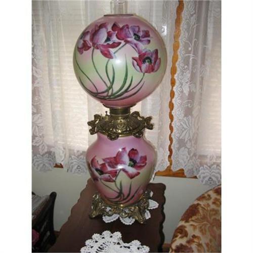 HERE IS A STUNNING ANTIQUE HAND PAINTED GONE WITH THE WIND LAMP IN GREAT CONDITION FEATURING CRANBERRY SHADED FLOWERS ON PINK GLASS. THE LAMP STANDS 26" TO THE TOP OF THE LARGE GLOBE. LAMP HAS BEEN ELECTRIFIED TOP AND BOTTOM AS CAN BE SEEN IN THE IMAGES. ALL THE PAINT IS THERE, NO SCRATCHES OR CHIPS AND GORGEOUS COLORS IN PERSON. FLOWERS ALL THE WAY AROUND. DATED TO THE HANDPAINTED ERA 1890-1915.