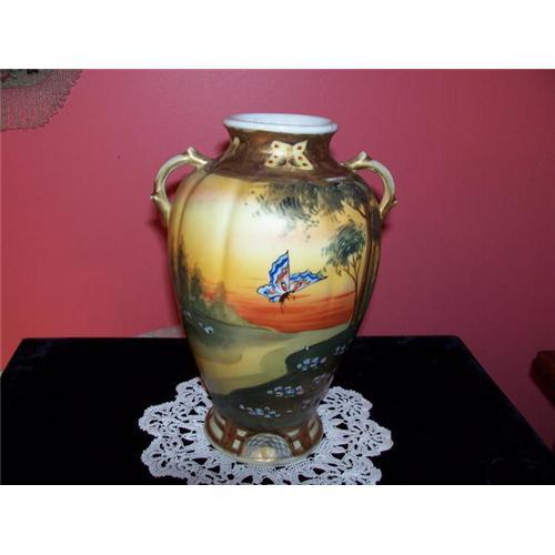 THIS IS A BEAUTIFUL HANDPAINTED ANTIQUE NIPPON VASE WITH THE HAND PAINTED NIPPON IMPERIAL BACKSTAMP AS PICTURED ON PAGE 145 #38 OF JOAN VAN PATTEN'S COLLECTOR'S ENCYCLOPEDIA OF NIPPON. ON THE FRONT IS A WONDERFUL AND COLORFUL BUTTERFLY IN FLIGHT AND ON THE BACK IT IS SURROUNDED BY TREES AND SKYLINE AND WONDERFUL COLORATION AND GOLD ALL AOUND THE TOP AND BOTTOM OF THE VASE. (5 AREAS ACTUALLY).THIS VASE IS IN PRISTINE CONDITION.