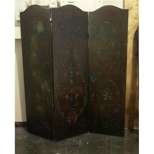 HAND PAINTED SCREEN: An Neoclassical style three panel screen/room divider, oil on canvas with varnish, foliate, swag, and urn motif on a dark brown ground. Both sides of the screen are painted but only the front side has painted motif, sides are bound with canvas strip and domed studs. Unsigned, unattributed. Condition noted. Each panel measures 69'' x 20'' x 1''. Circa mid-20th century.