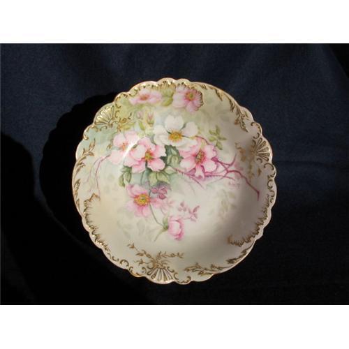 THIS IS A MAGNIFICENT HAND PAINTED ARTIST SIGNED (A.H. PHINNEY) BOWL DECORATED WITH BEAUTIFUL DELICATE PINK AND WHITE FLOWERS AND GOLD GILDING. THE MARK IS C A FRANCE DEPOSE (1903). . IT MEASURES 8.5" IN DIAMETER AND IS 2" DEEP. THERE ARE NO CHIPS CRACKS REPAIRS OR GOLD WEAR ON THIS ITEM.