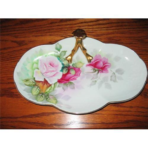 HERE IS A GORGEOUSLY HAND PAINTED TRAY ATTRIBUTED TO WM. GUERIN LIMOGES WHICH FEATURES SUPERBLY PAINTED PINK ROSES AS SEEN IN THE IMAGES. THE SPLITCENTERED HANDLE IS LAVISHLY GILDED AND FEATURES A FLOWER AT THE TOP. THERE ARE NO CHIPS CRACKS HAIRLINES OR GOLDWEAR. THERE IS NO BACKSTAMP MARK ONLY THE WORD "HANDPAINTED" AS SEEN IN THE IMAGES. THIS DISH IS THE EXACT SAME BLANK AS THE DIMENSIONS OF ONE FEATURED IN GASTON'S COLLECTORS ENYCLOPEDIA OF LIMOGES (3RD ED) ON PAGE 142. IT MEASURES 11" BY 6.5".