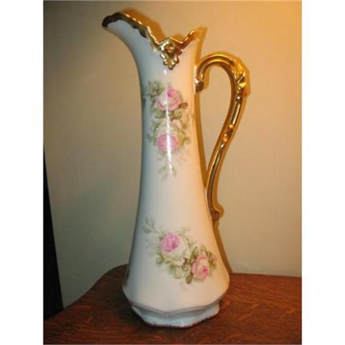 GORGEOUS ANTIQUE HAND PAINTED LIMOGES TANKARD WITH CLUSTERS OF PINK AND WHITE ROSES IN GREAT CONDITION!</em></td>