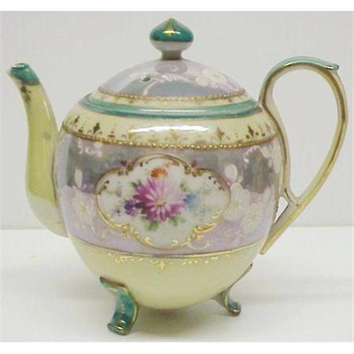 GORGEOUS ANTIQUE TEAPOT,HAND PAINTED DEPICTING COLORFUL FLOWERS, GOLD GILT AND FINE BEADING ON LUSTER BACKGROUND.EXCELLENT DETAIL AND VERY PLEASING COLORS,IT STANDS 5 1/4" HIGH AND ABOUT 6" FROM THE SPOUT TO THE HANDLE.VERY GOOD CONDITION BUT FOR THE SPOUT, IT IS HAS A CHIP AS PER IMAGES ,US BUYER TO PAY 8.00 FOR SHIPPING PLUS INSURANCE.THANK YOU.
