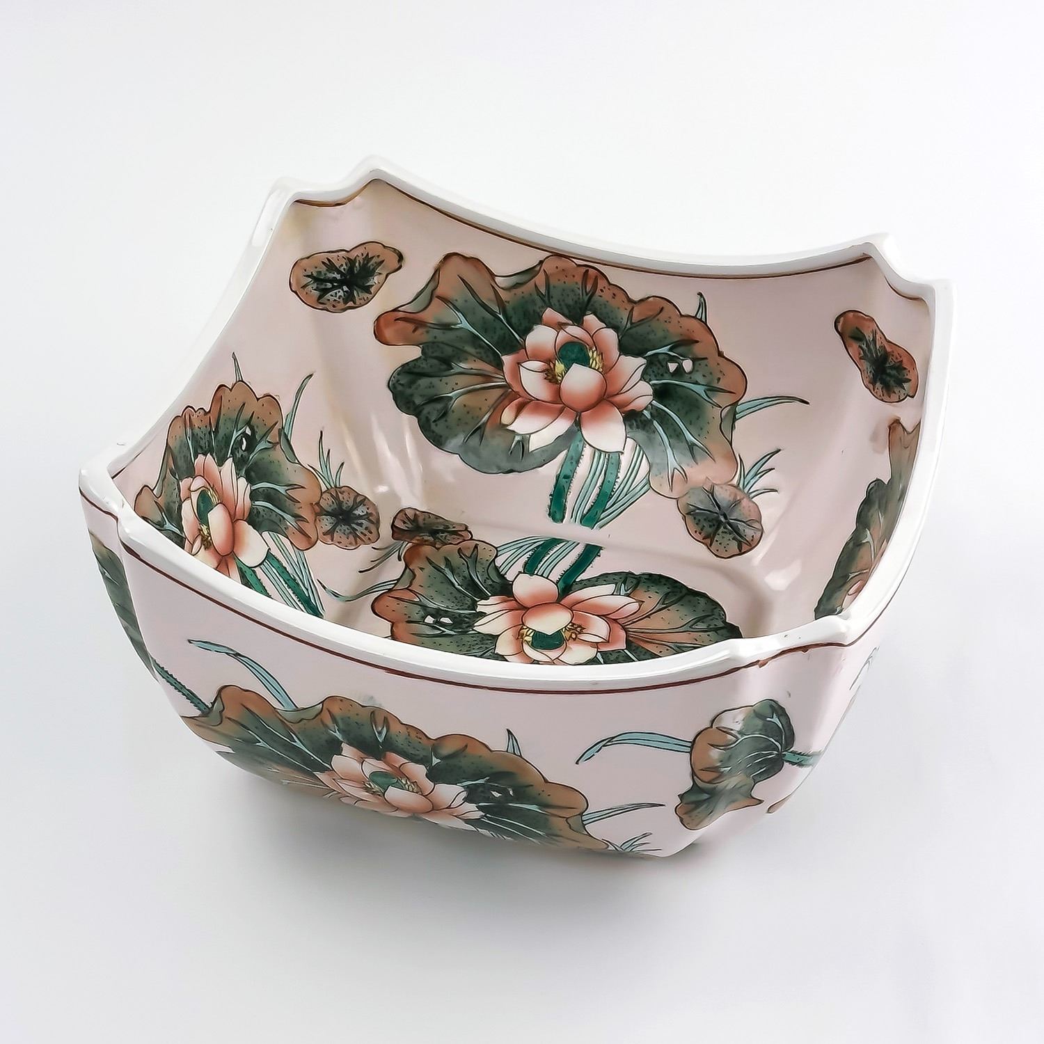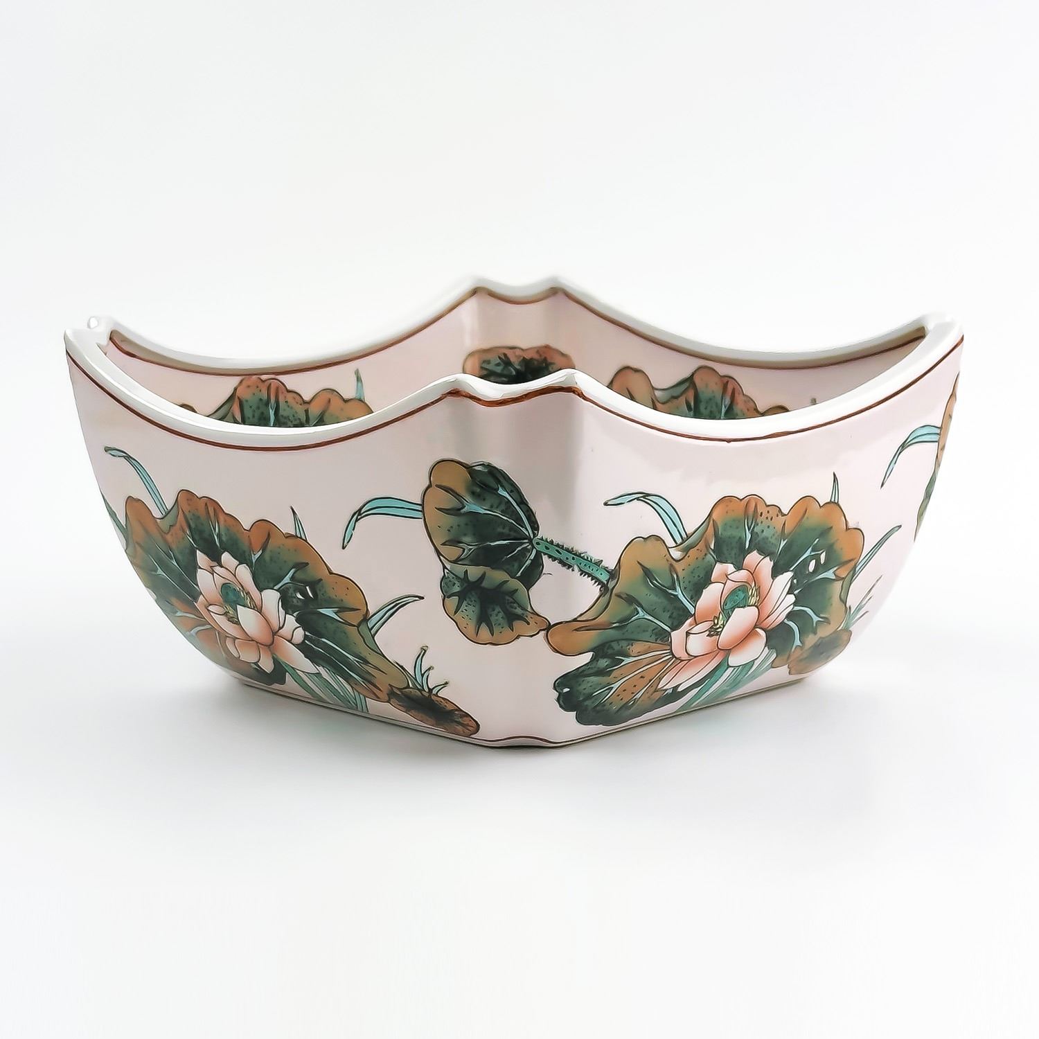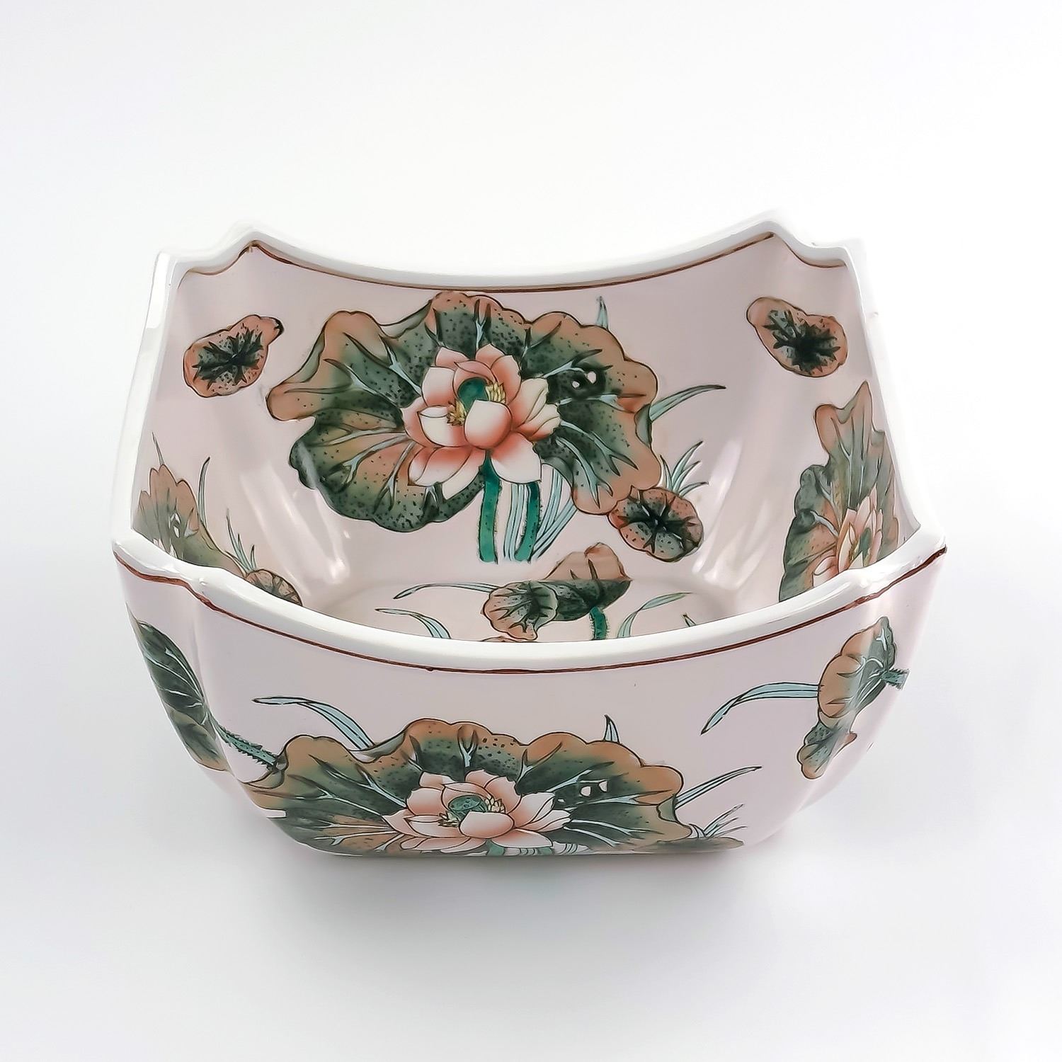 #8259 - BEAUTIFUL FLORAL THEMED PATTERN ON UNIQUELY SHAPED BOWL. KITCHENWARE CENTERPIECE BOWL OR DISH SCULPTURE. MEASURES: 9.25” (23.5 CM) BY 9.63” (24.5 CM) AND SITS 4.75” (12 CM) HIGH