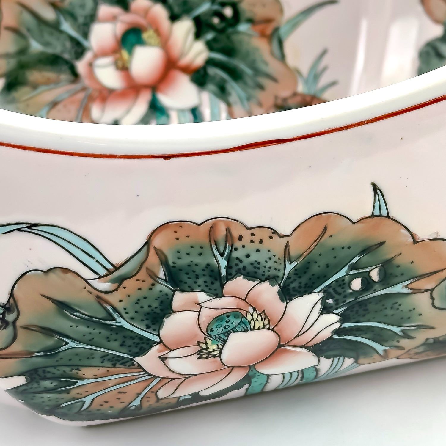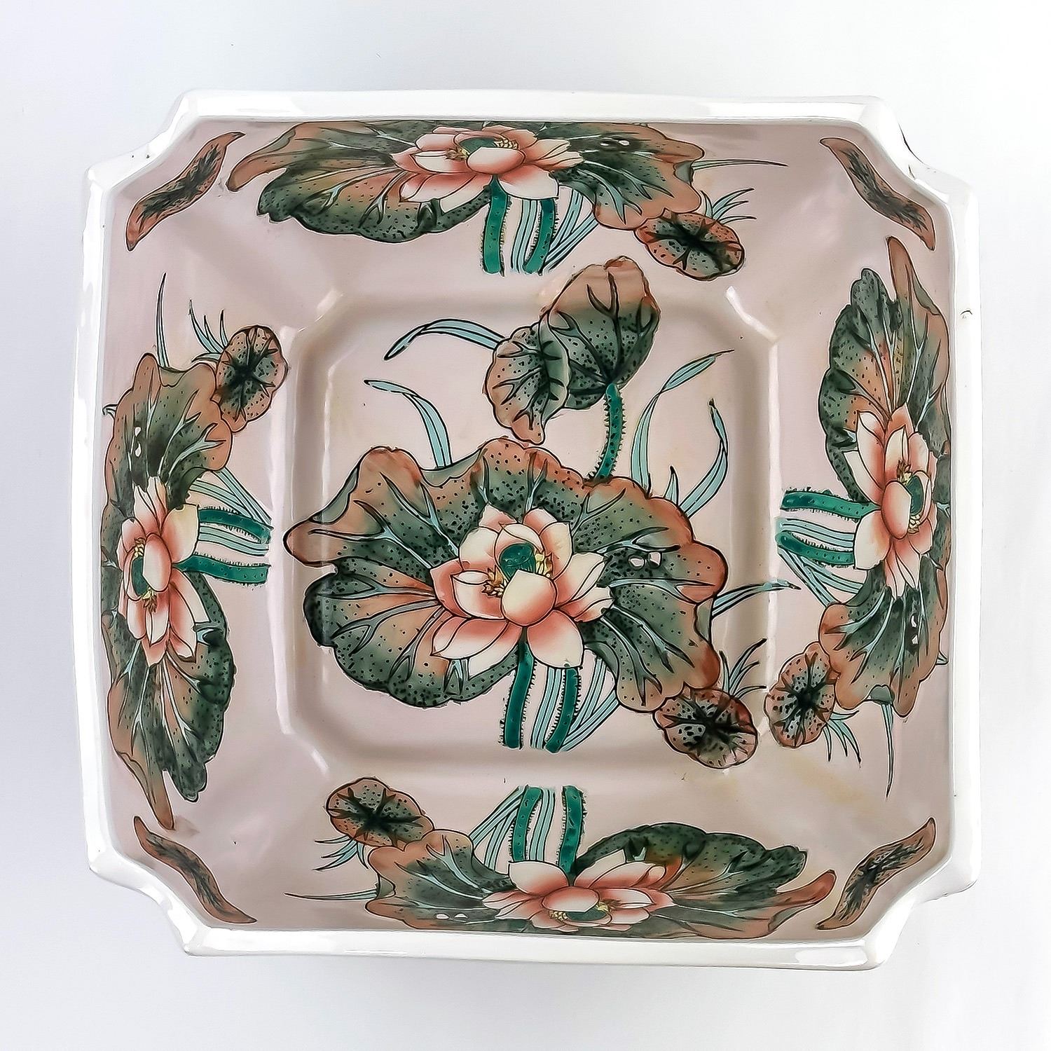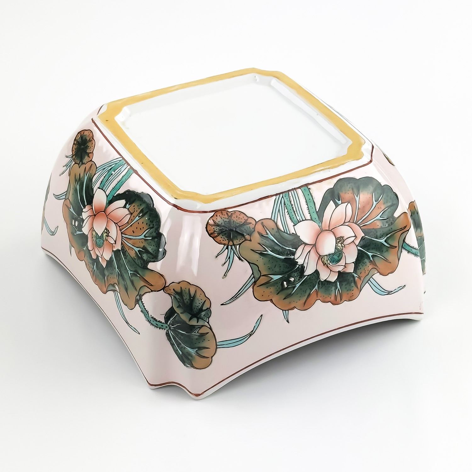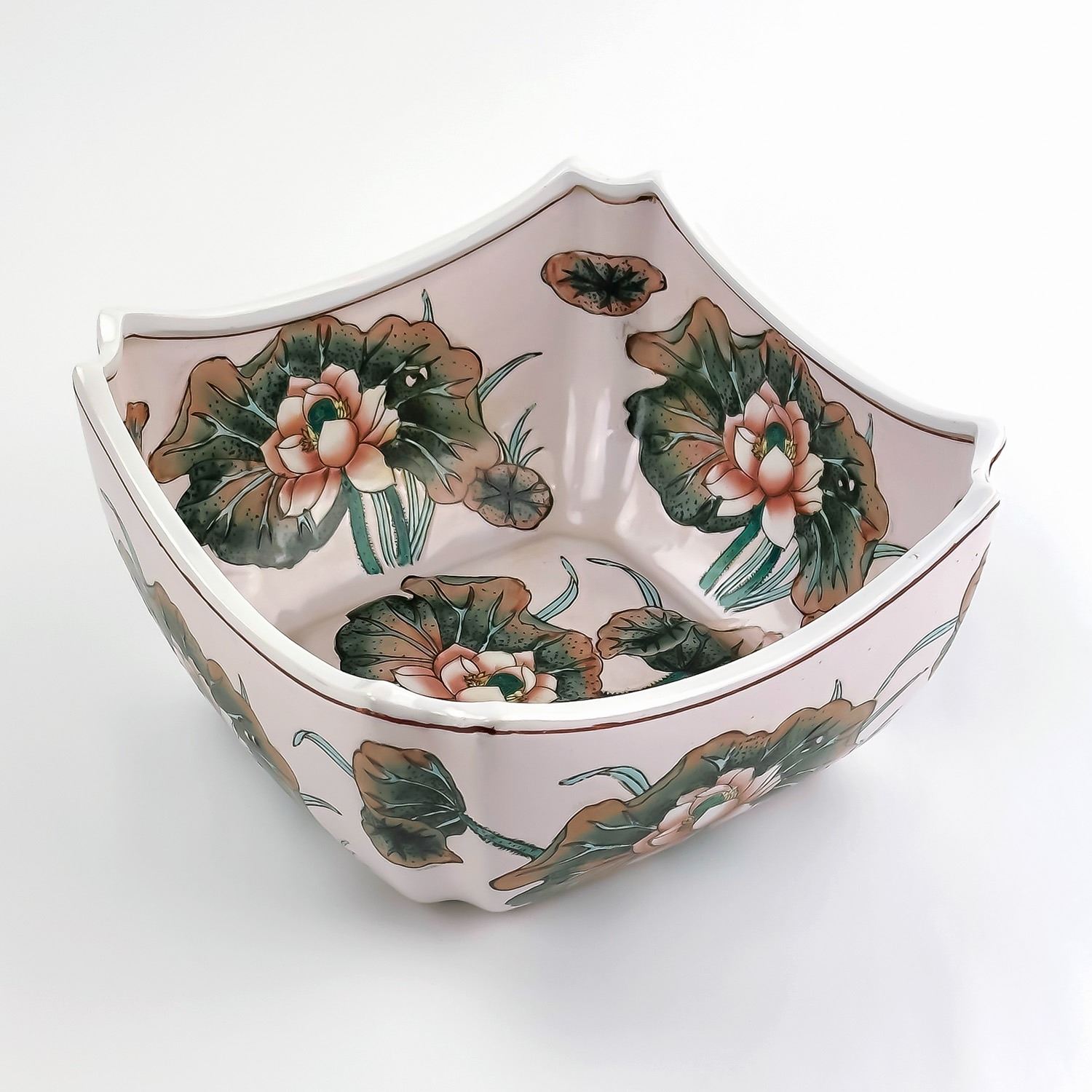 #8259 - BEAUTIFUL FLORAL THEMED PATTERN ON UNIQUELY SHAPED BOWL. KITCHENWARE CENTERPIECE BOWL OR DISH SCULPTURE. MEASURES: 9.25” (23.5 CM) BY 9.63” (24.5 CM) AND SITS 4.75” (12 CM) HIGH