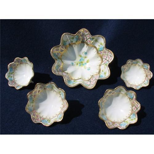 LOVELY HAND PAINTED JAPANESE NUT SET DECORATED WITH DELICATE PINK AND BLUE FLOWERS AND BORDERED THROUGHOUT WITH ELABORATE AND INTRICATE GOLD GILDING. STUNNINGLY BEAUTIFUL AND VERY EYECATCHING. USEFUL FOR SERVING OR DECORATION.