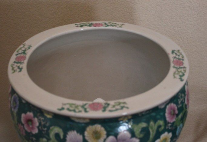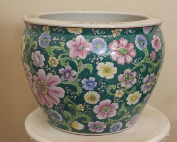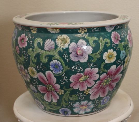 HAND PAINTED PORCELAIN FISH POT - 10"H X 13" DIAMETER - TEXTURED DESIGN -