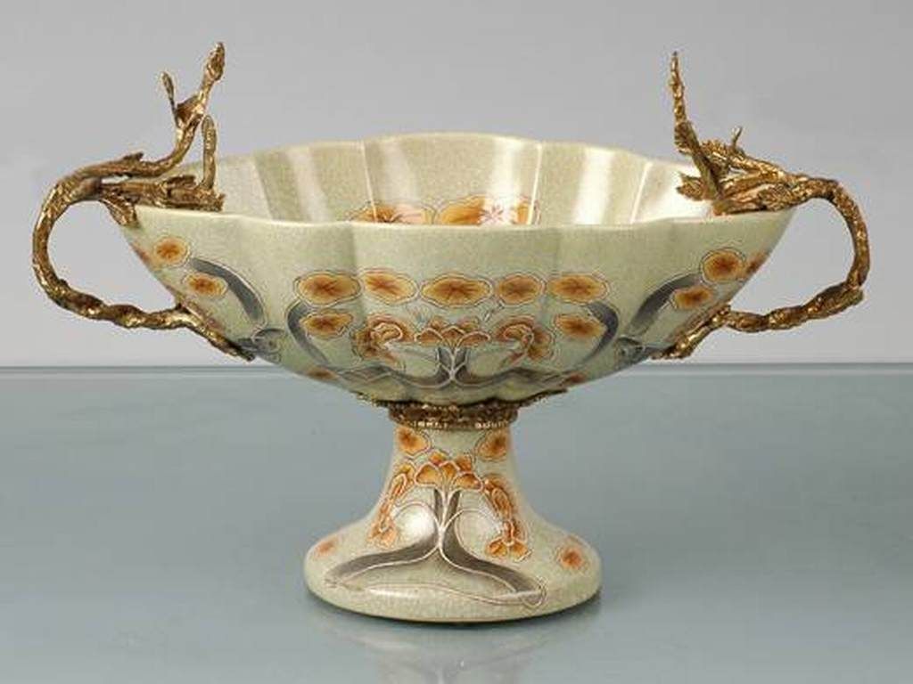 HAND PAINTED PORCELAIN FOOTED BOWL - HAND PAINTED YELLOW FLORAL DESIGN - CRACKLED PORCELAIN FINISH - BRASS HANDLES AND TRIM - 17L" x 8.5W" x 9H"