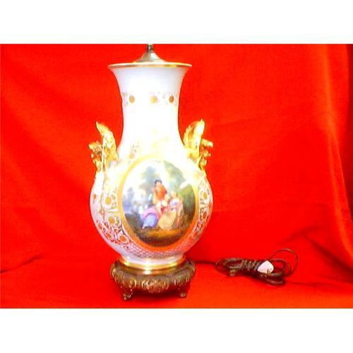 19th CENTURY OLD PARIS LAMP WITH VERY LIGHT GREEN COLOR AND PAINTING ON BOTH SIDES AND HEAD OF TWO GRIFFINS HANDLE AND BRONZE BASE . THERE IS SOME AGE WORN ON GOLD.