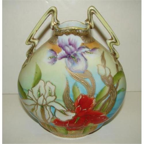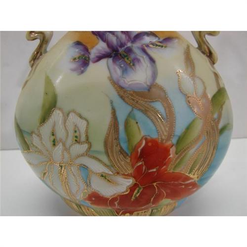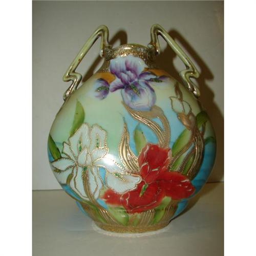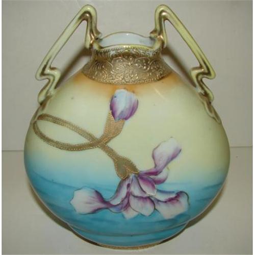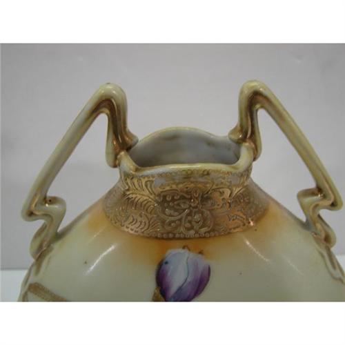 HAND PAINTED DOUBLE HANDLED PORCELAIN PILLOW VASE. Features hand painted and gilt jeweled floral decoration at front and back with gilt painted handles. Shows some loss to gilt at handles. Marked on bottom with illegible green mark. 8” H