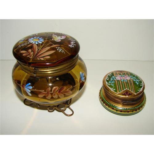 PAIR OF HAND PAINTED GLASS POWDER JARS. One jar rests on a brass base and is decorated with flowers and a butterfly (3.5" H). The other jar is decorated with a pink floral decoration (1.625" H).