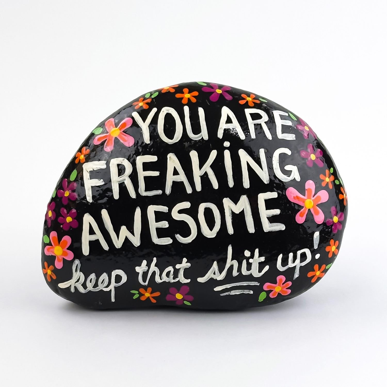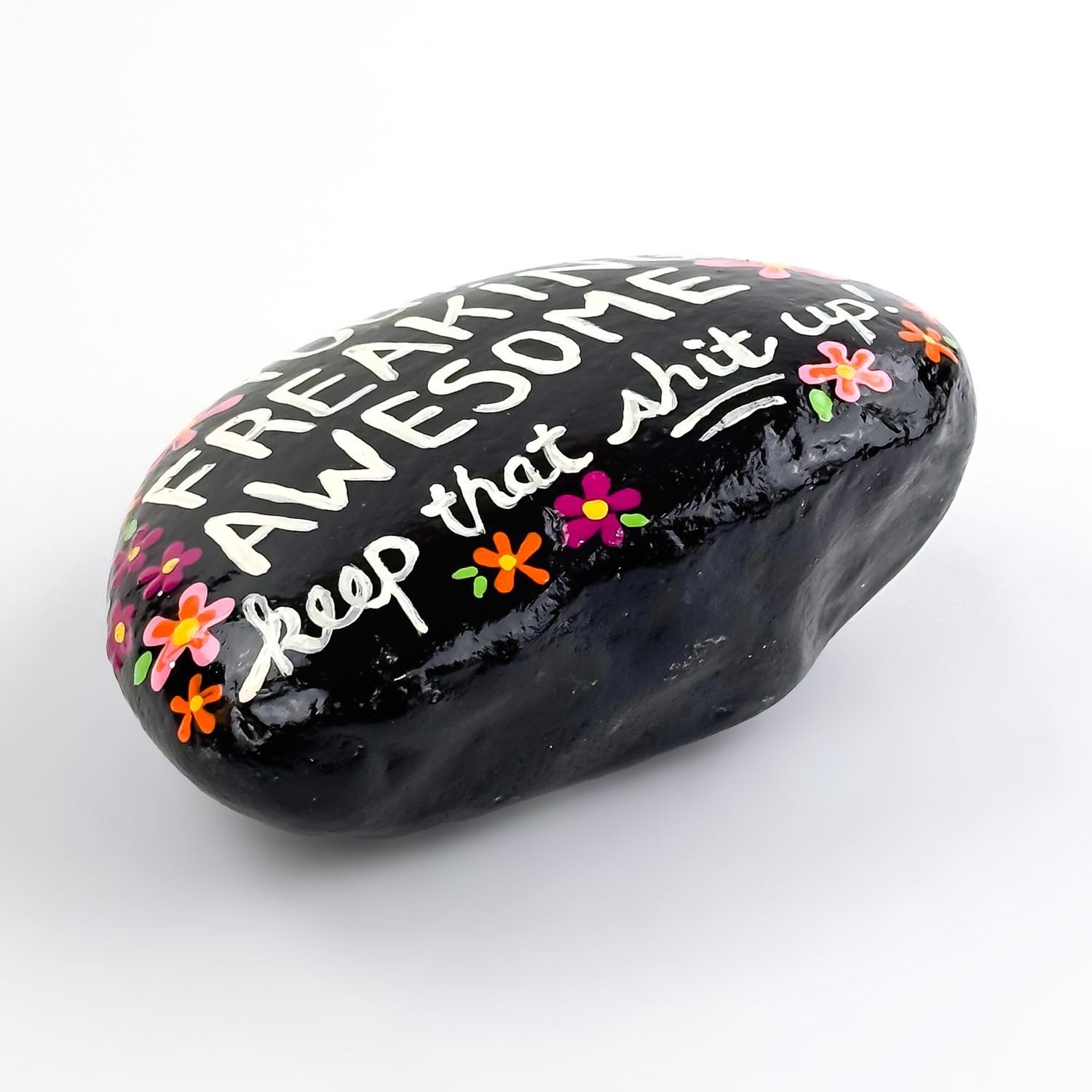 #8184 - ARTIST UNKNOWN - BUT ROCK IS MILLIONS OR BILLIONS OF YEARS OLD. LARGE HAND PAINTED 1800 GRAMS (3.97 POUNDS) ROCK STONE PAINTING PAPERWEIGHT. YOU ARE FREAKING AWESOME - KEEP THAT #!%& UP!. PAINTED SAYING - INSPIRATIONAL?…. WITH FLOWERS FLORAL THEME. MEASURES: 6.75” (17 CM) LONG BY 4.75” (12 CM) WIDE AND SITS 2.75” (7 CM) HIGH. NOTE: DOES NOT STAND ON IT’S OWN - NEEDS HELP - PROPPED UP IN BACK FOR PHOTO. HOME OR OFFICE DECOR SCULPTURE PAPERWEIGHT