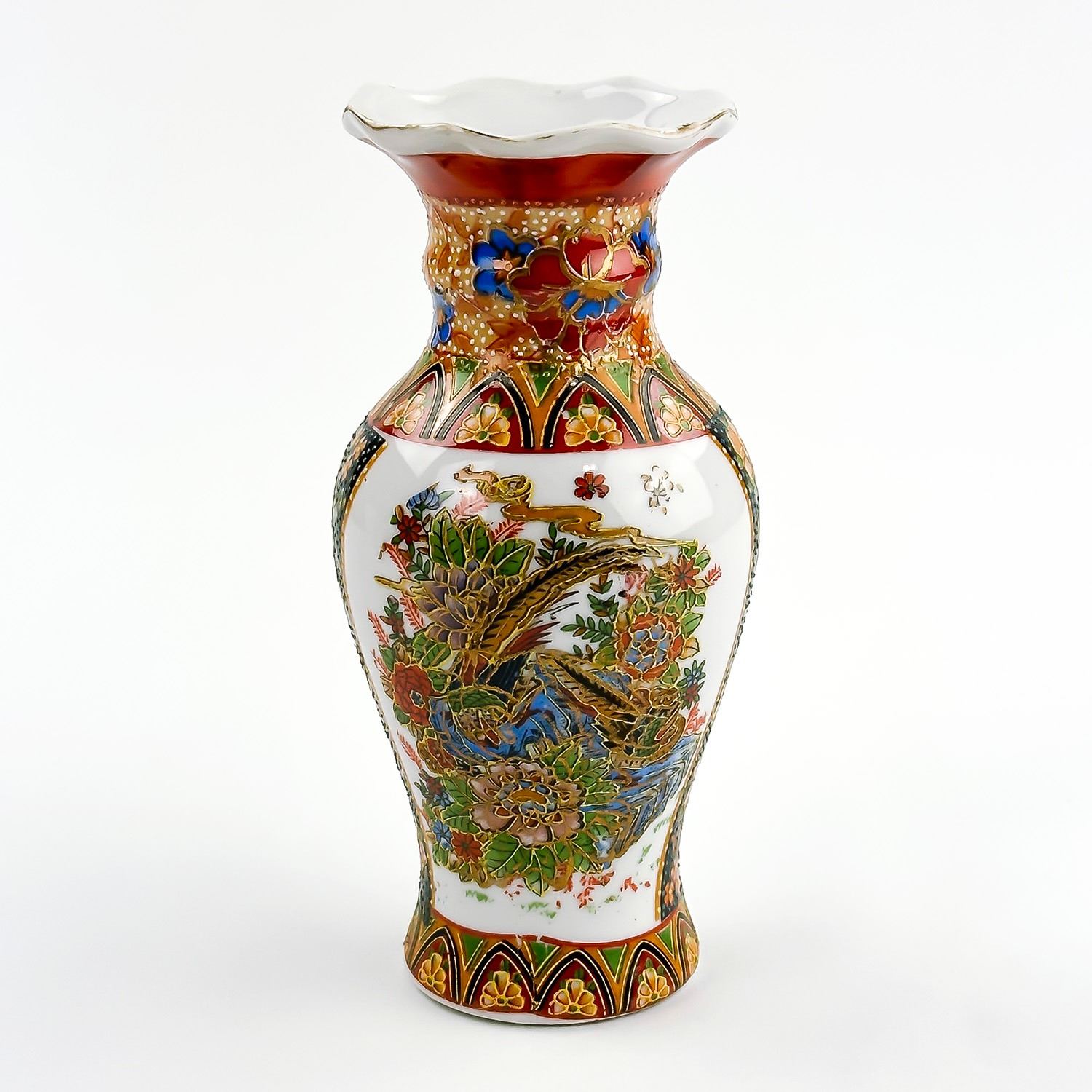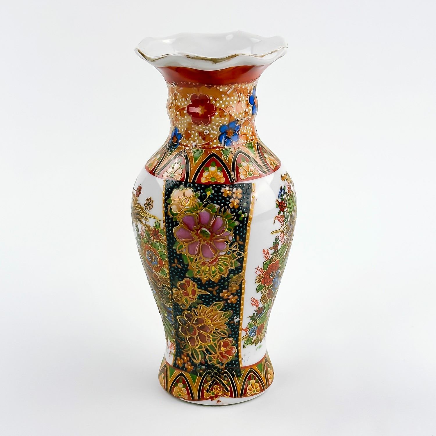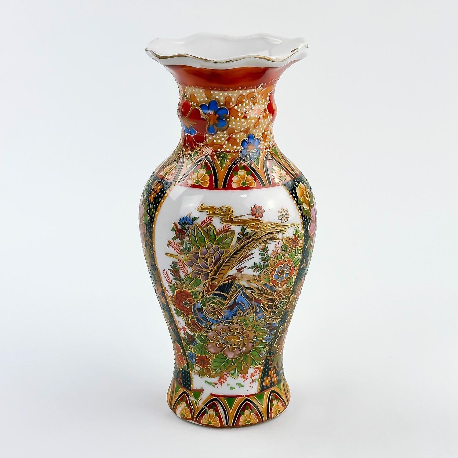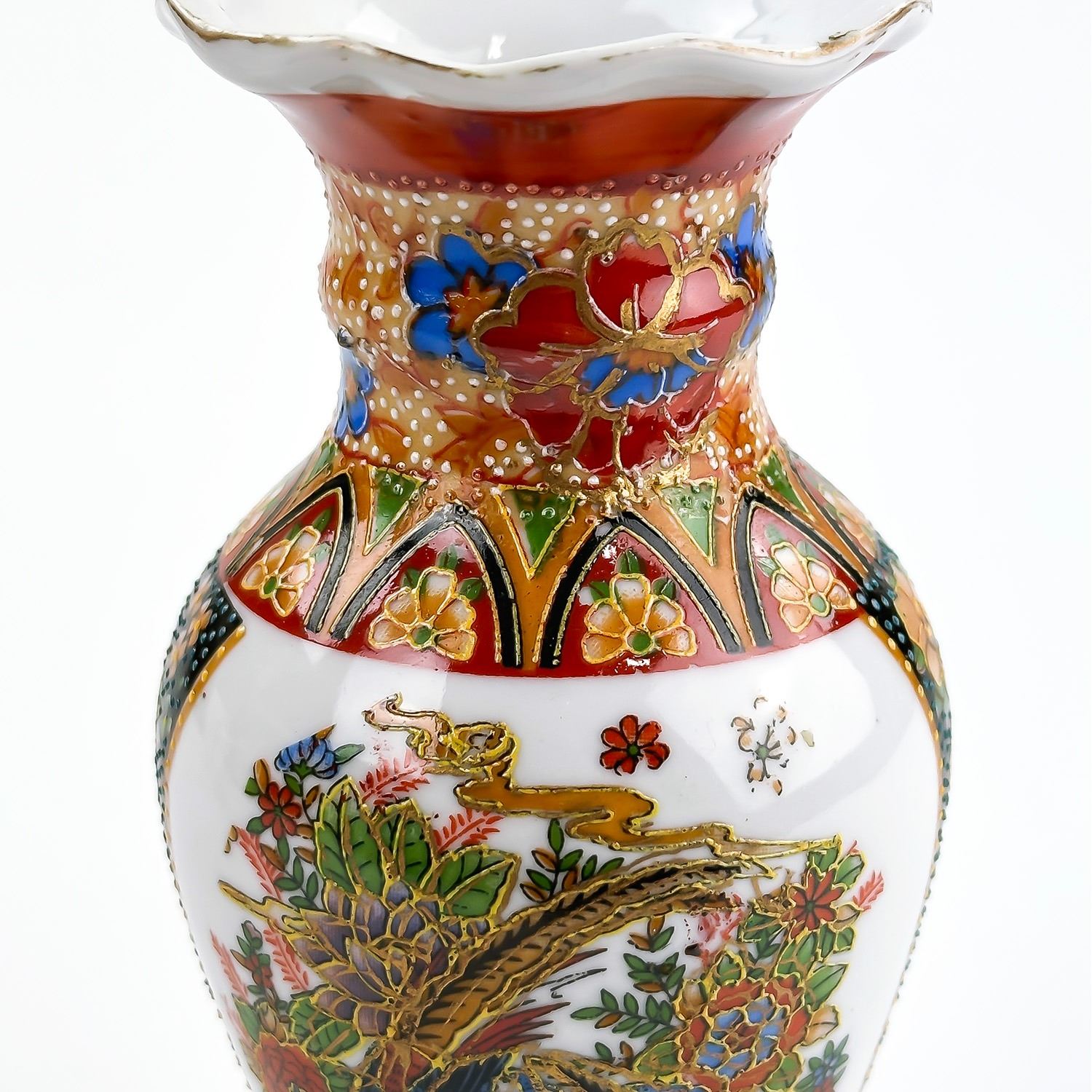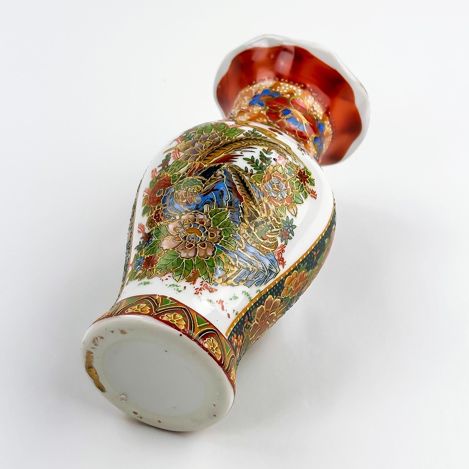 #8230 - SMALL ORNATE HAND PAINTED VASE. UNSIGNED - AGE AND MAKER UNKNOWN. MEASURES: 5.75” (14.5 CM) TALL BY 2.75” (7 CM) WIDEST DIAMETER