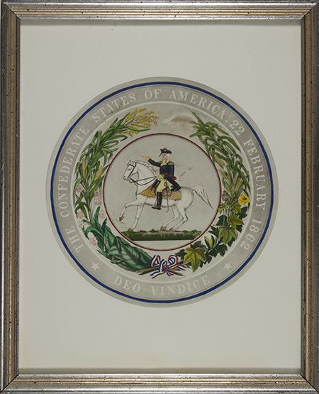 A fine objet d'art, a color print of the Great Seal of the Confederate States of America, 6 1/4" dia., intricately hand-colored in oil ca. 1950. Of course, the original imprints could not have been done in color, so this representation brings forth the colors intended in the original depiction of the seal. Matted, slightly rubbed in a few spots, but overall very good condition.
