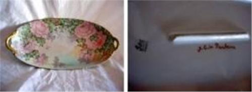 HAND PAINTED SIGNED "GCH LARLEIU" FLORAL PLATE IN AN OBLONG SHAPE WITH GOLD PAINTED ACCENTS ON HANDLES AND EDGING. 6.5"X14".