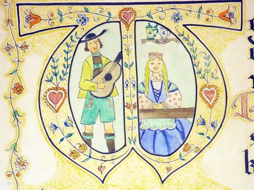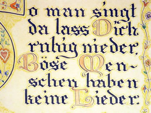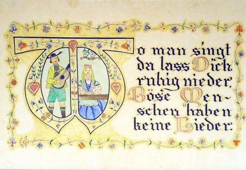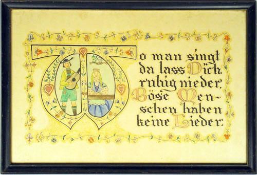 HAND PAINTED WATER COLOR SAYING IN OLD GERMAN. HAND PAINTED WATER COLOR. DELIGHTFUL HAND-DECORATED WATERCOLOR AND CALLIGRAPHY. FRAMED DECORATIVE PLAQUE WHICH APPEARS TYROLEAN BASED ON COSTUMES OF MANDOLIN PLAYER AND SINGER. APPROXIMATE TRANSLATION OF OLD GERMAN EXPRESSION: WHERE MEN ARE SINGING YOU CAN TAKE YOUR REST (OR FIND PEACE) AS BAD MEN SURELY DONT KNOW SONG. QUITE CHARMING, READY TO DISPLAY. Size: 19X13 inches. Country of Origin: Germany.
