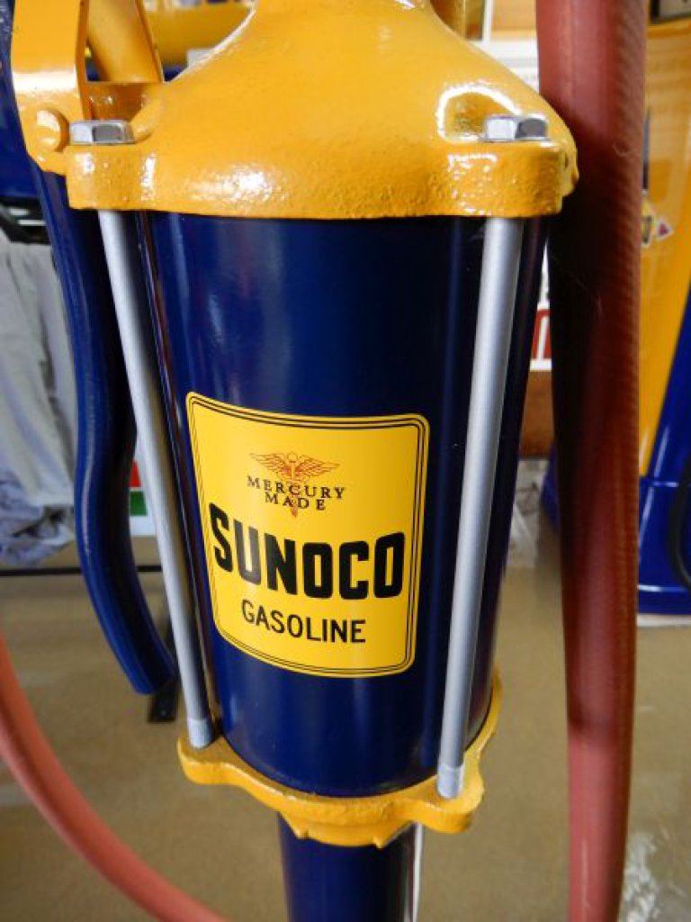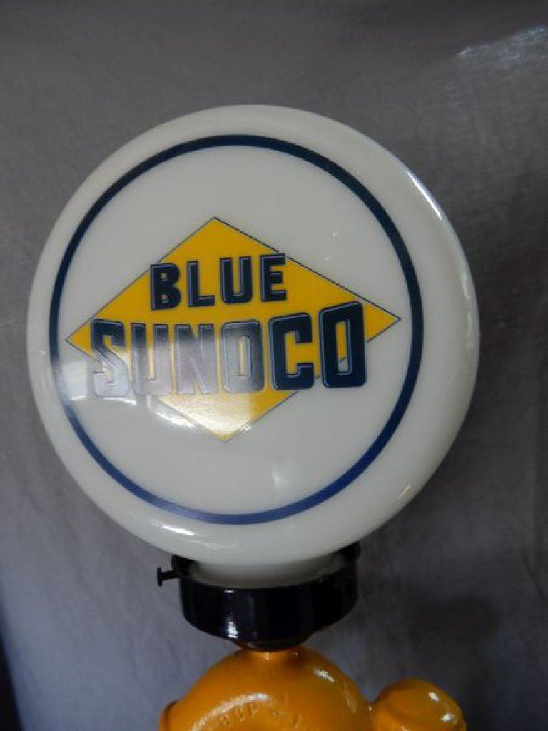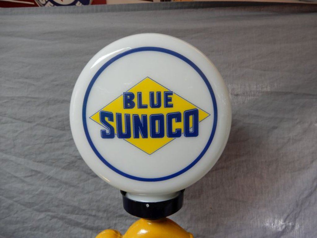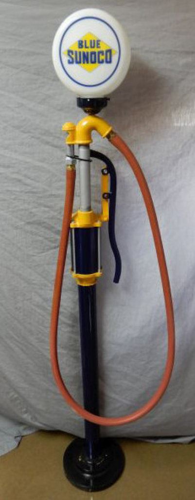 HAND PUMP PROFESSIONALLY RESTORED SUNOCO ON PEDESTAL - SMALL MILKGLASS SUNOCO GAS PUMP GLOBE - LIGHTS UP LOCATION: LOWER LEFT