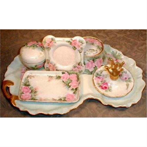 <tr><td>Title:HAND Painted VANITY Set 6 pieces ANTIQUE</td></tr>