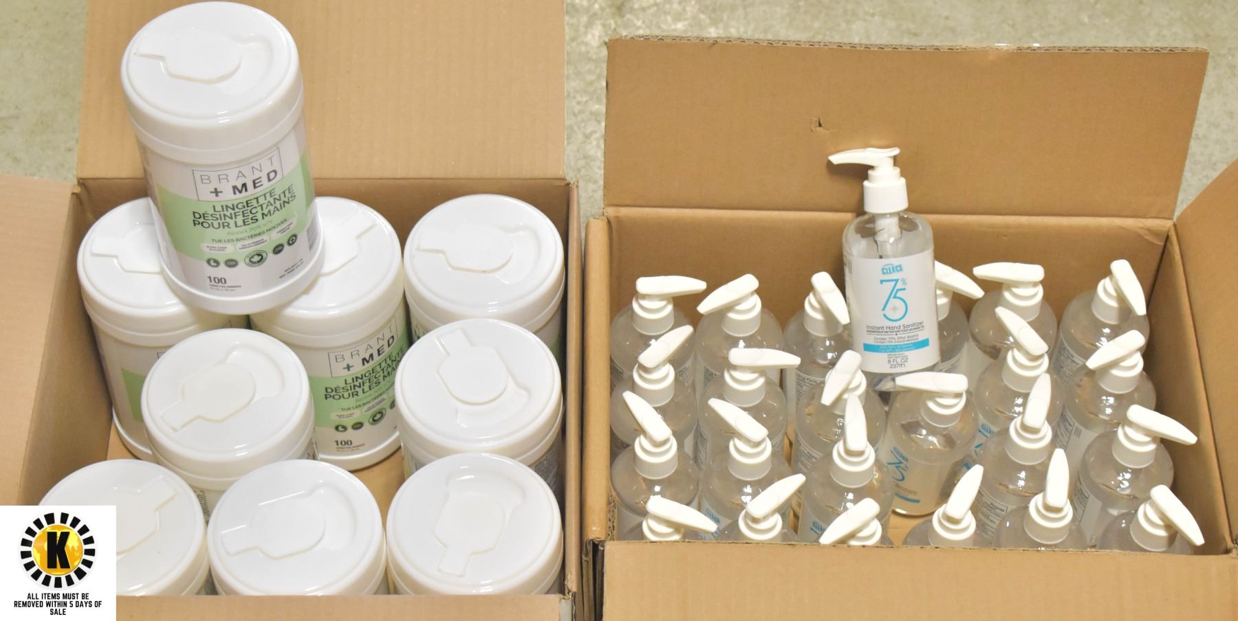 HAND SANITIZER: 237ML, 24 BOTTLES 75%. AND SANITIZER WIPES: 9 CANISTERS X 100 WIPES 70%