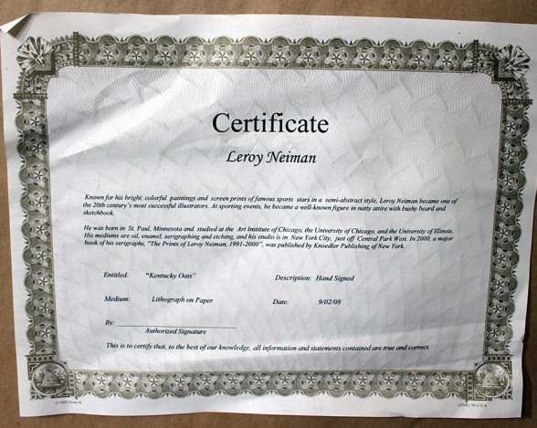 HAND SIGNED NEIMAN LITHOGRAPH - "KENTUCKY OATS" - DOUBLE SIGNED (HAND SIGNED BY LEROY NEIMAN IN LOWER RIGHT CORNER AND PLATE SIGNED) - PROFESSIONALLY FRAMED & MATTED - FRAMED SIZE 32" X 26.5" - COMES WITH CERTIFICATE OF AUTHENTICITY