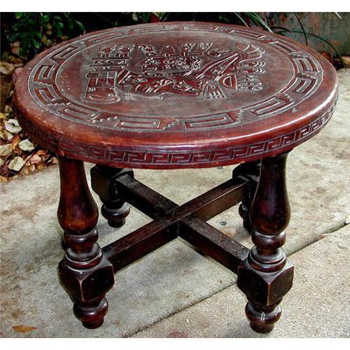 HAND-TOOLED LEATHER & WOOD AZTEC OR INCA DESIGN STOOL<p>A highly decorative low stool with hand-tooled leather seat on a strong wooden base. The design depicts an Aztec or Incan deity with various bird and other embellishments, including geometric designs around the borders. This is an attractive piece with excellent workmanship that is strong enough and rigid enough to hold a statue for display, or a person who might sit on it. Condition is very good, with only minor blemishes to its surface. Age is circa mid-20th century, and origin is probably indigenous Mexican. Height is 11.5", and diameter of the top is 14.25".