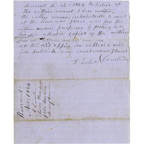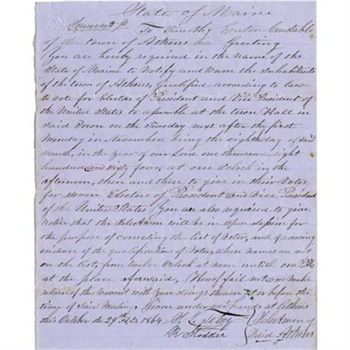 <B>HAND WRITTEN DOCUMENT “LINCOLN’S ELECTION” STATE OF MAINE</B></I> <B>1864.</B></I> Manuscript Document Signed "A. S. Toby", One page, 8” x 9.75”. <I>“Warrant - Nov. 1864 A. Lincoln chosen president of the United States of America”. “</B></I>In part:” <I>State of Maine to Timothy Eaton Constable of the town of Athens greeting you are hereby required in the name of the State of Maine to notify and warn the inhabitants of the town of Athens, qualified according to law to vote for electors of President and Vice President of the United States to assemble at the town Hall in said Town on the Tuesday next after the first Monday in November, being the Eighth day of said month, in the year of our Lord one thousand eight hundred and sixty four, at one O’clock in the afternoon, then and there to give in their voter for seven electors of President and Vice President of the United States, Etc</B></I>. Interesting content for the announcing of Lincoln being elected. <BR><BR><B>Provenance: </B></I>Al. Emmett Fostell Collection<B> </B></I><BR><BR><B>Condition:</B></I> Overall fine, minor foxing, has 2 small tears on folds<BR><BR><b>Shipping:</b> Miscellaneous Collectibles, Smal (<a target="_blank" href="http://www.heritageauctions.com/common/shipping.php">view shipping information</a>)