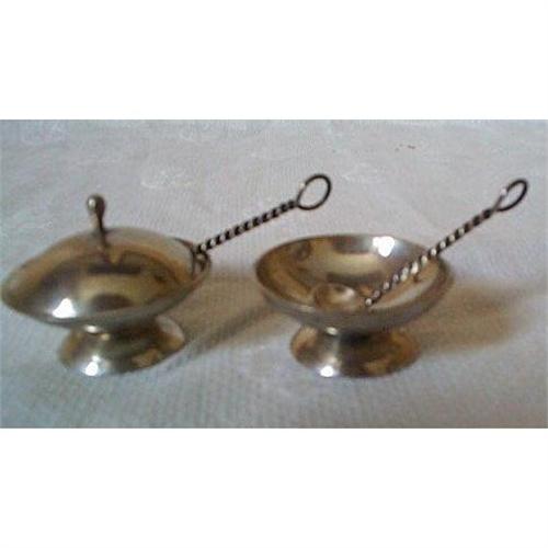 A MOST ADORABLE MINIATURE PAIR OF OPEN SALTS! STANDING ON A LOVELY LITTLE PEDESTAL BASE, ONLY 1/2" TALL WITH A DIAMETER OF 1 1/4". ONE SALT HAS A COVER WITH NOTCHED LID TO HOLD THE SPOON, THE OTHER IS OPEN. BOTH ARE MARKED: HAND WROUGHT R.V TEMMING, BELIEVED TO BE GERMAN IN ORIGIN. SPOONS HAVE A TWISTED HANDLE AND ARE UNMARKED. CONDITION IS VERY GOOD; NO DENTS OR REPAIRS. ADDITIONAL PHOTOS AVAILABLE UPON REQUEST. WE ARE WELL EXPERIENCED IN PACKING/SHIPPING WORLDWIDE, WHICH IS NOT EXPENSIVE FROM MONTREAL, CANADA.