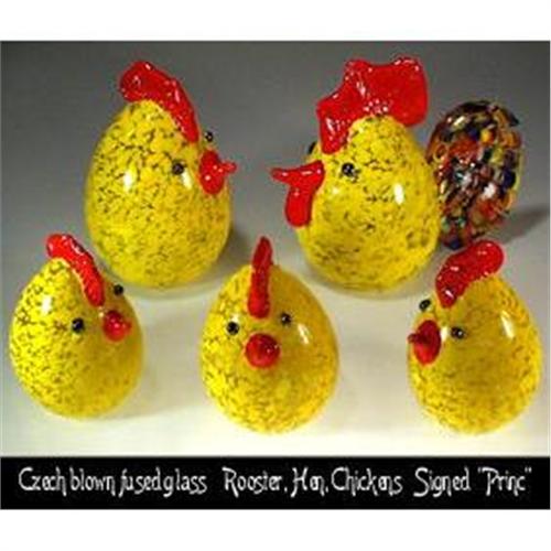 Please note that for Ebay Live Auction only bids at or above $140 will be successful and meet our reserve.Charming hand blown and fused Art glass set - Rooster, Hen and 3 Chickens. Excellent condition, no chips, cracks, scratches or repairs. Dimension : Rooster 4-1/2" high, Hen 4" high, Chickens 3" high. Signed "Princ Art Glass" Bohemia Glass. For Ebay Live Auctions photos are automatically reduced and (destorted), if you wnat to see larger, more detailed pictures, please email us.