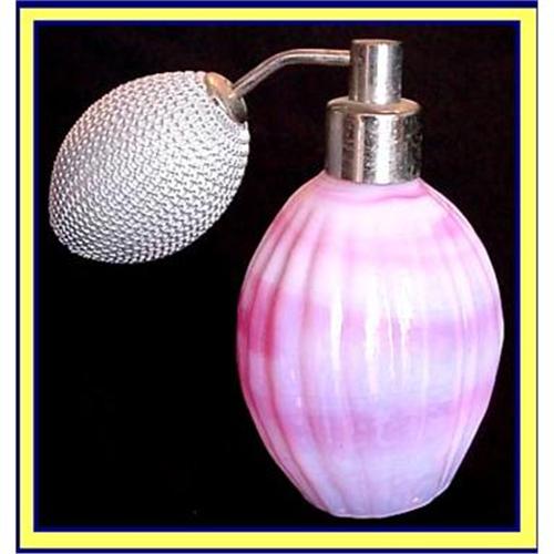 Handblown pink/white marbled glass perfume bottle atomiser.<BR>About 4inches high.<BR>Very pretty pink and white marbled glass with slight iridescence / opaline look. Ribbed, oval shape.<BR>No marks. <BR>Good condition.