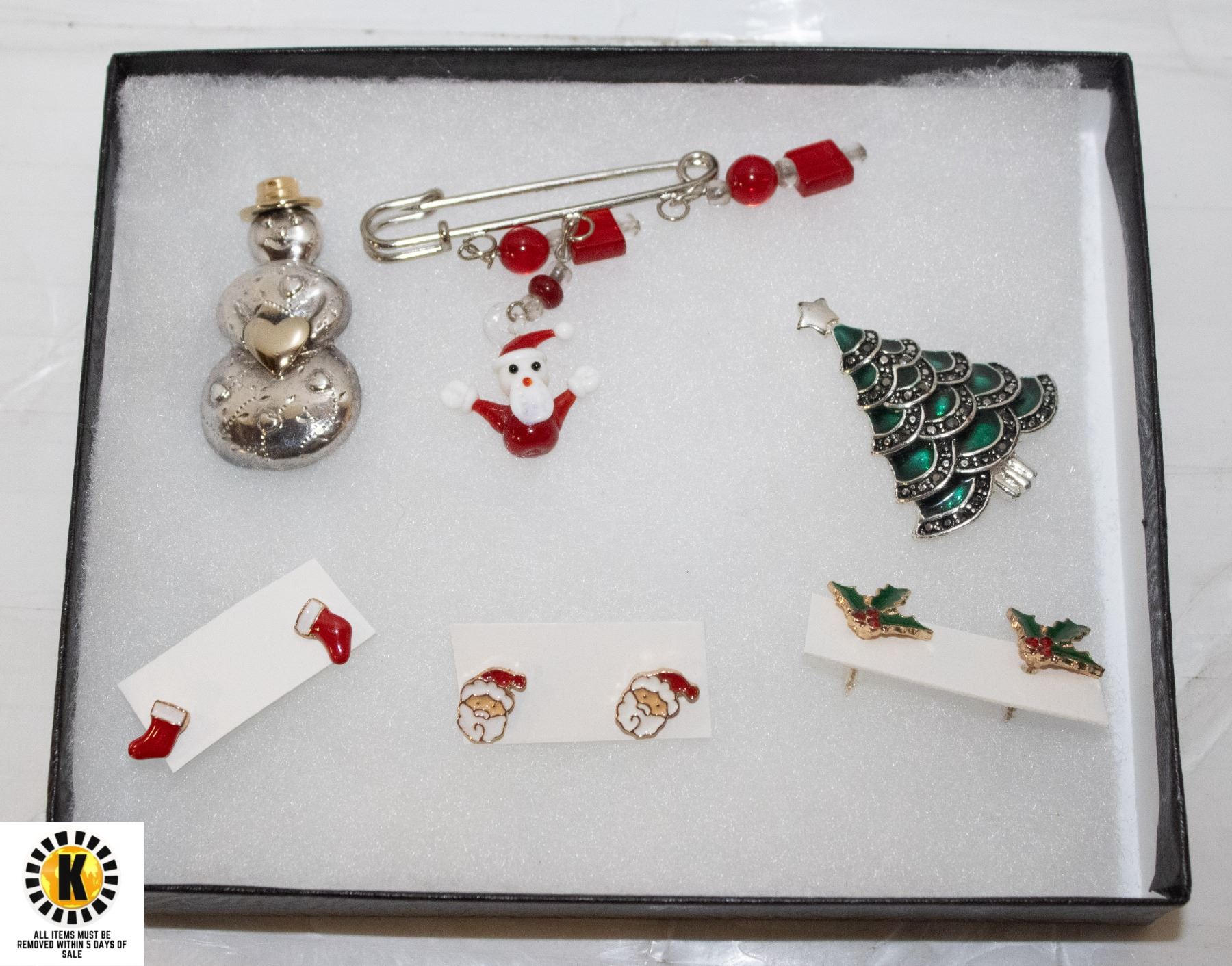 HANDBLOWN SANTA PIN & 2 BROOCHS + 2 EARRINGS