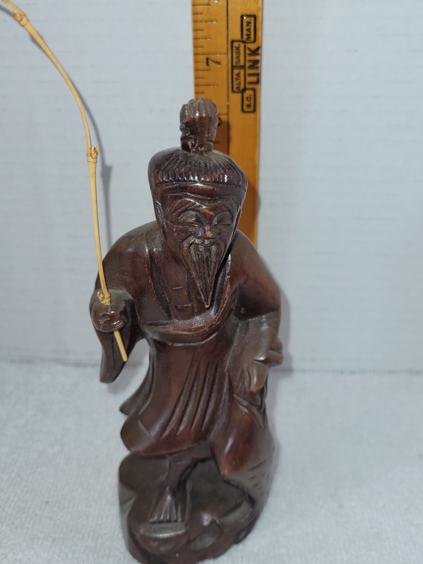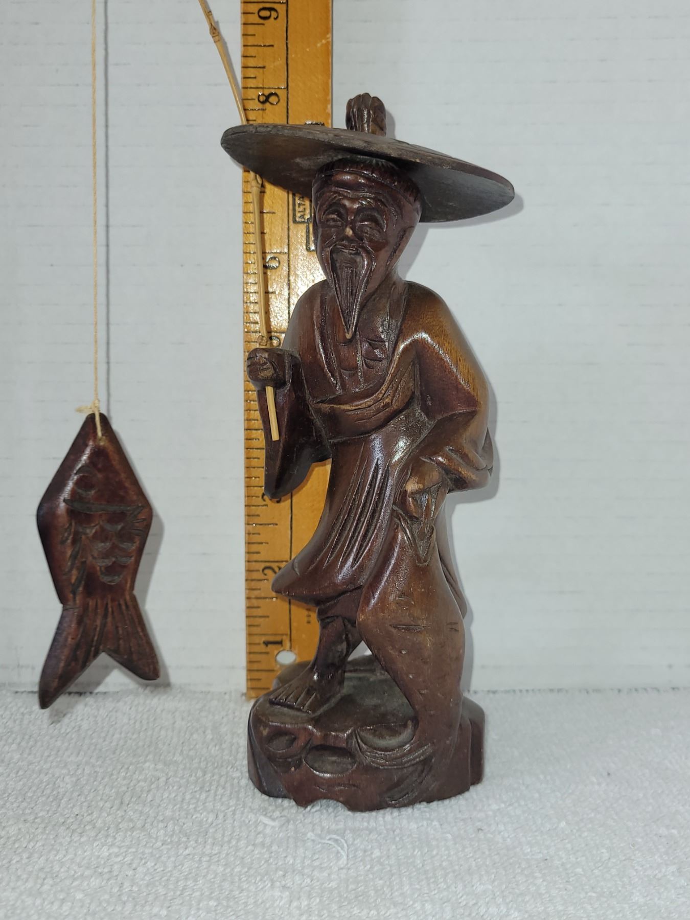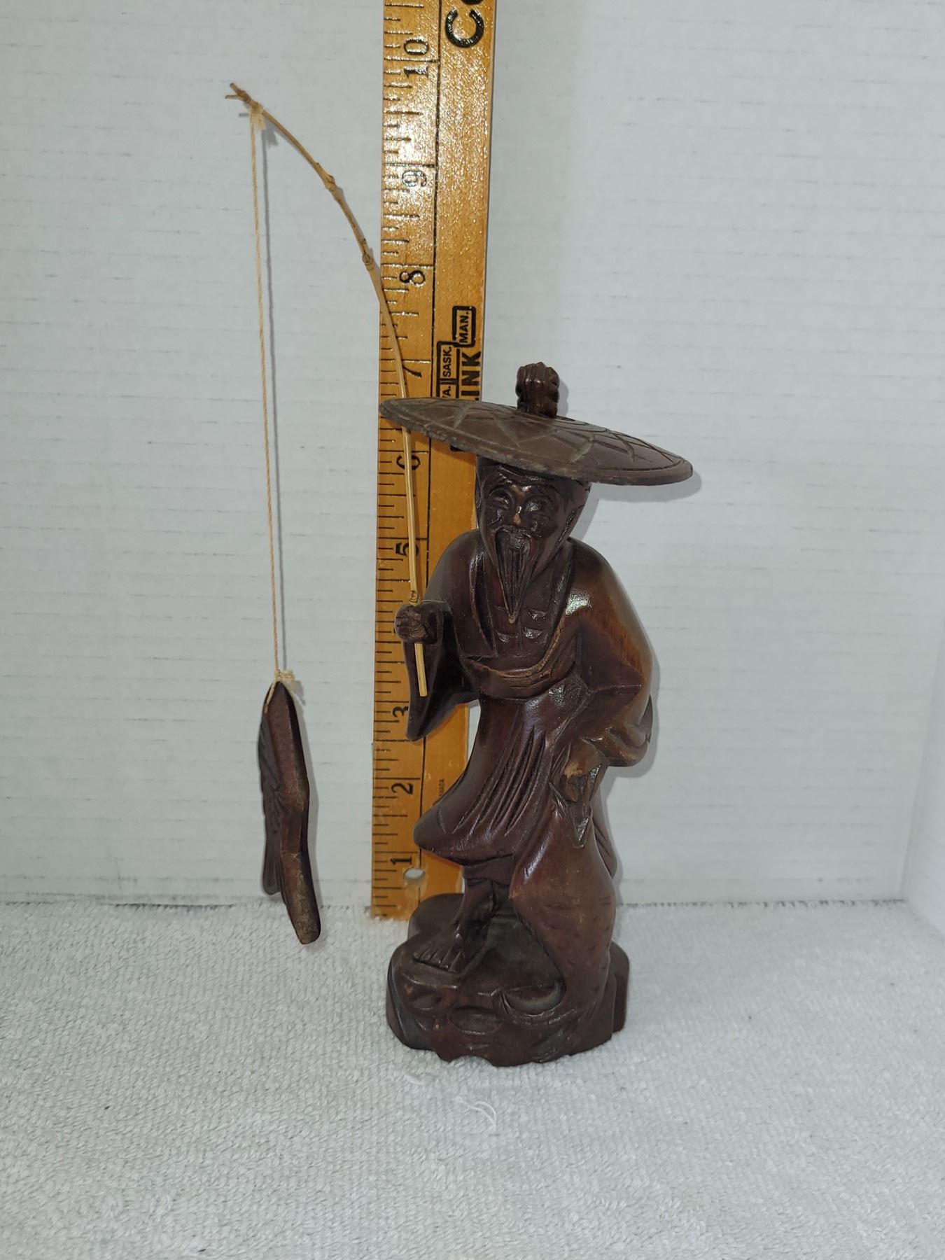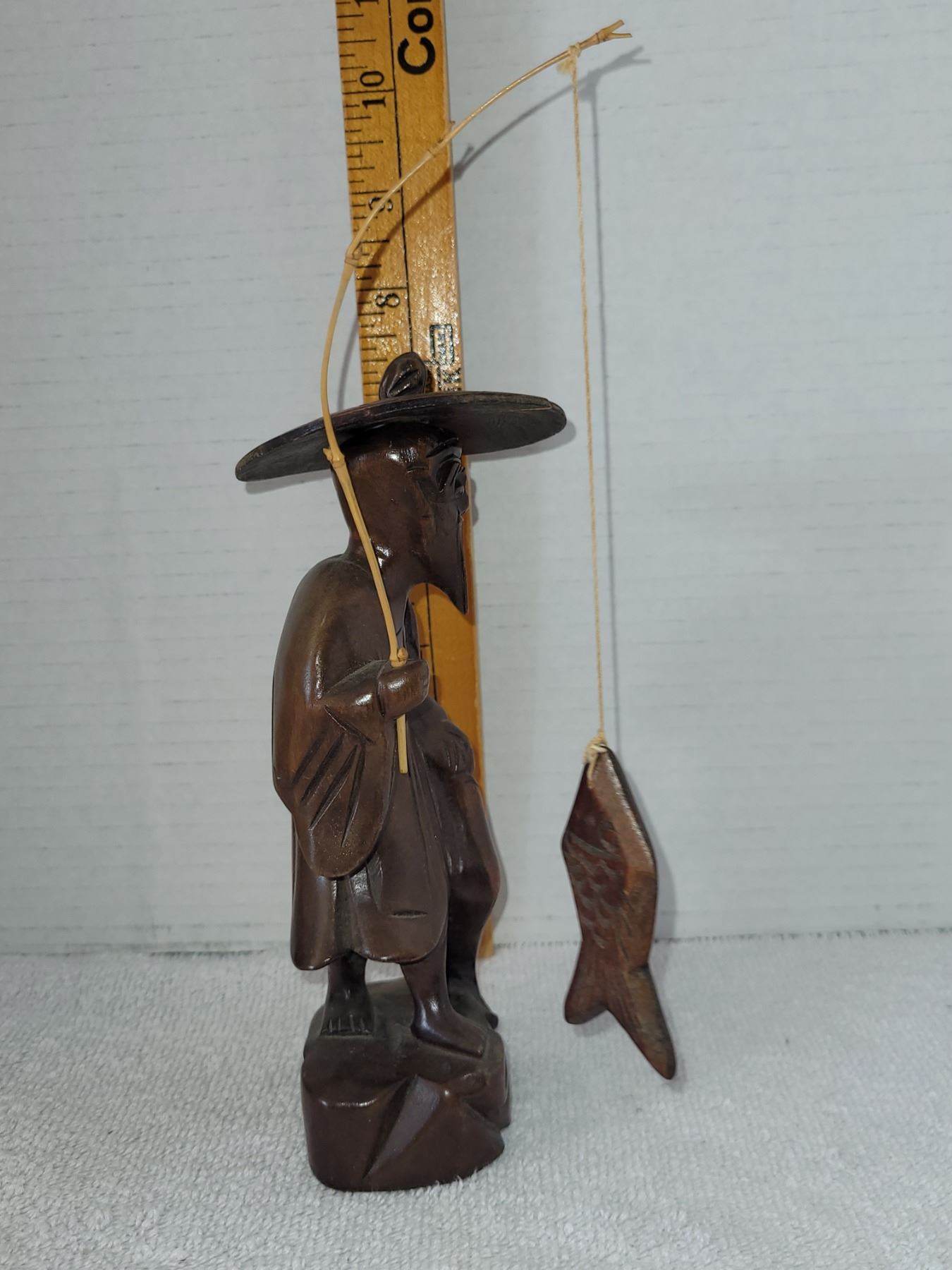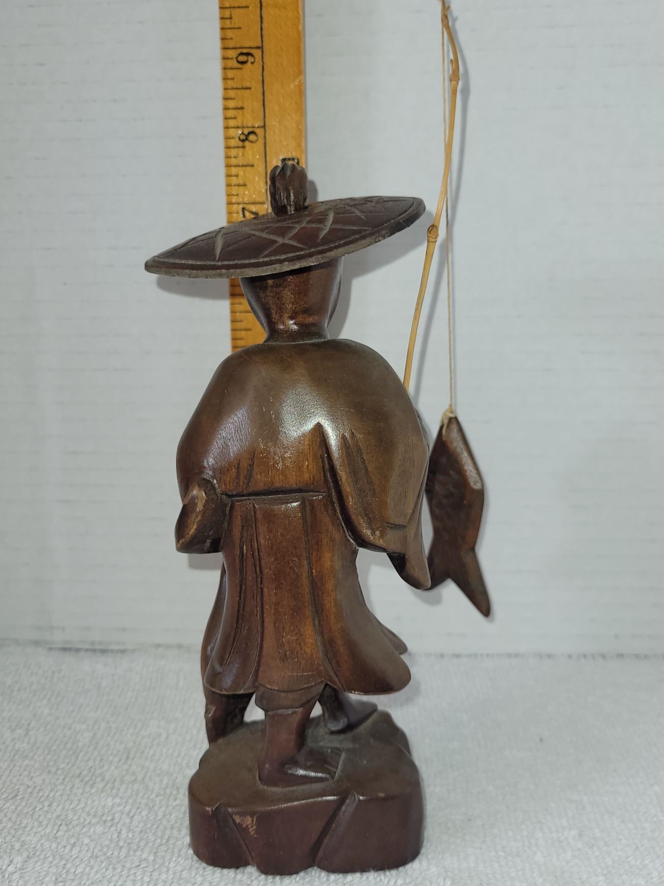 HANDCARVED WOODEN THAI FISHERMAN STATUE. WITH REMOVABLE HAT. MEASURES 9.5" TALL.